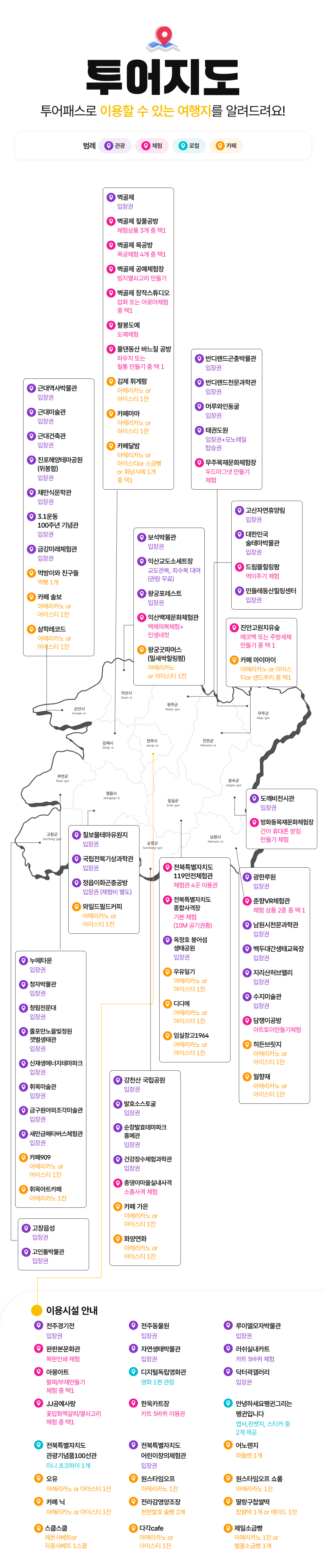 전북의 다양한 관광지뿐만 아니라 카페까지 프리패스할 수 있는 전북투어패스 플러스권을 소개할게요. 플러스권과 함께라면 여행 필수코스인 관광지와 체험시설, 전시, 그리고 플러스권만의 혜택, 분위기 있는 카페에서의 향긋한 커피까지 무료로 즐길 수 있어요. 24시간 동안 무제한으로 다양한 관광지를 여행하고 커피 한잔의 여유까지, 완벽한 여행을 만들어 보세요. 합리적인 가격으로 전북 여행을 떠나는 최고의 방법, 오픈특가로 진행되는 전북투어패스 플러스권과 함께하세요.