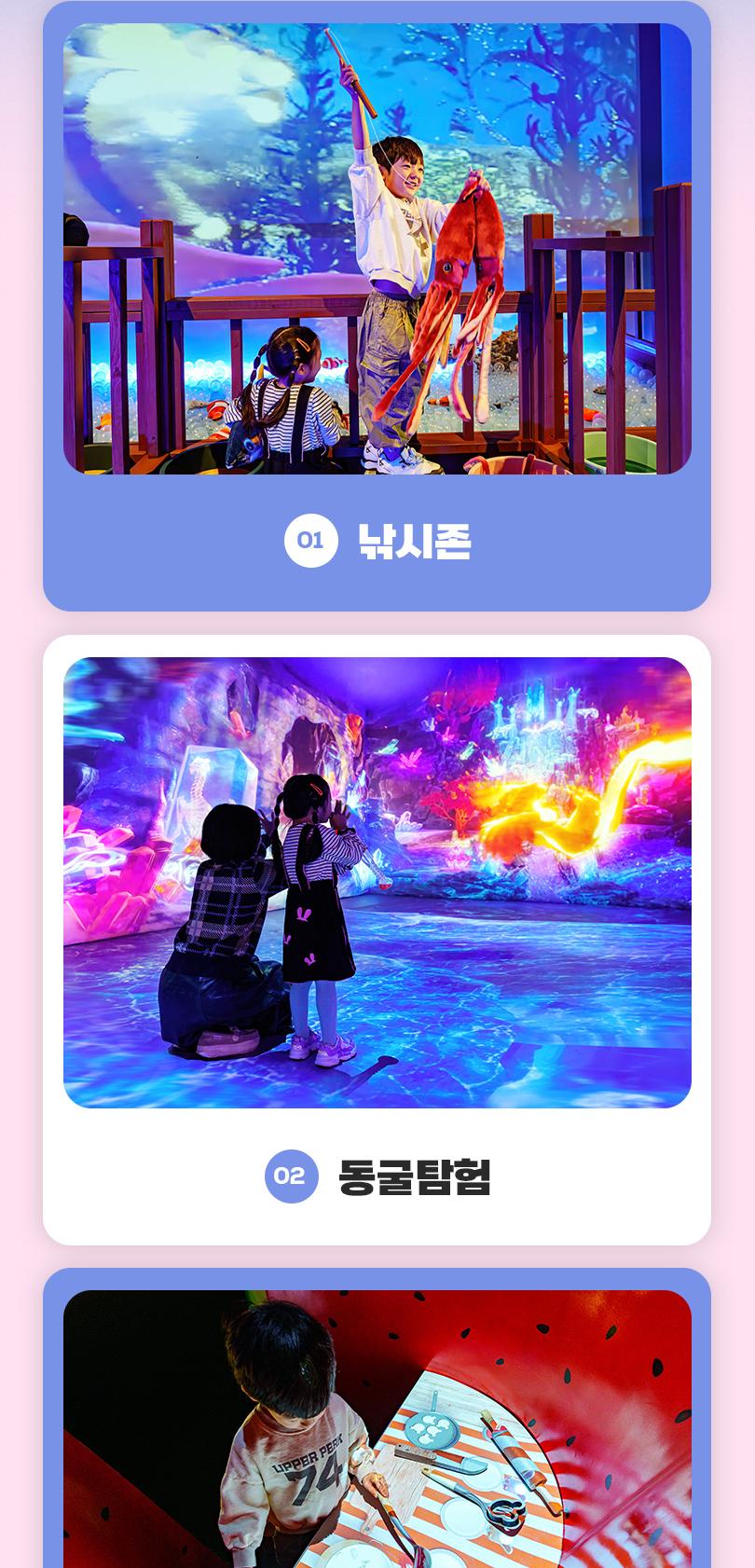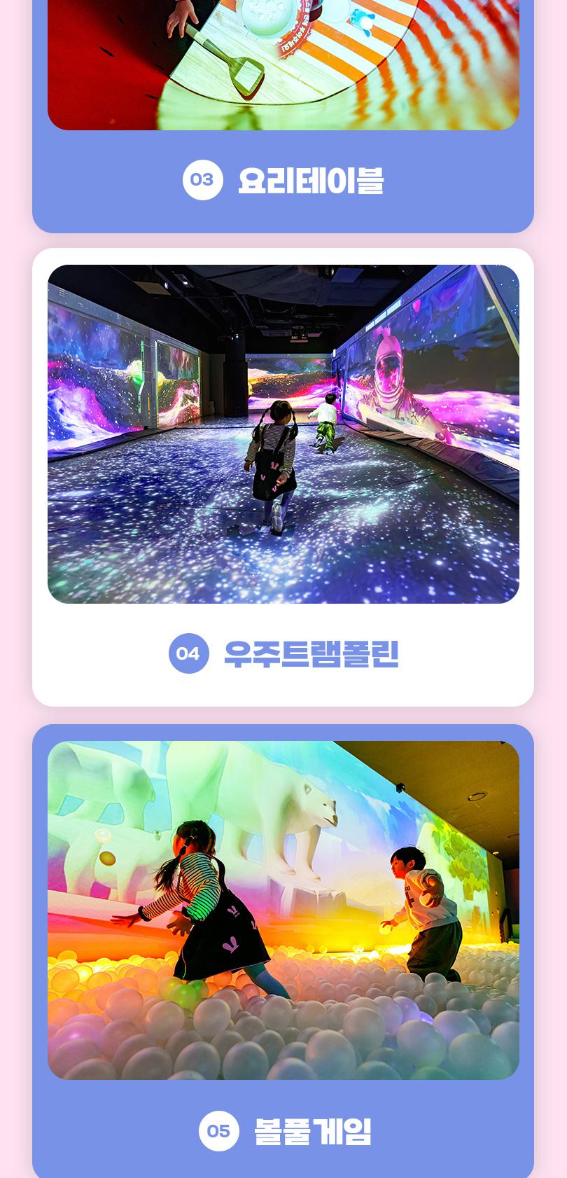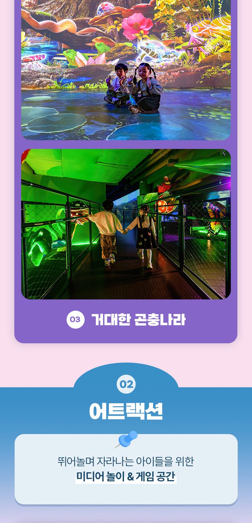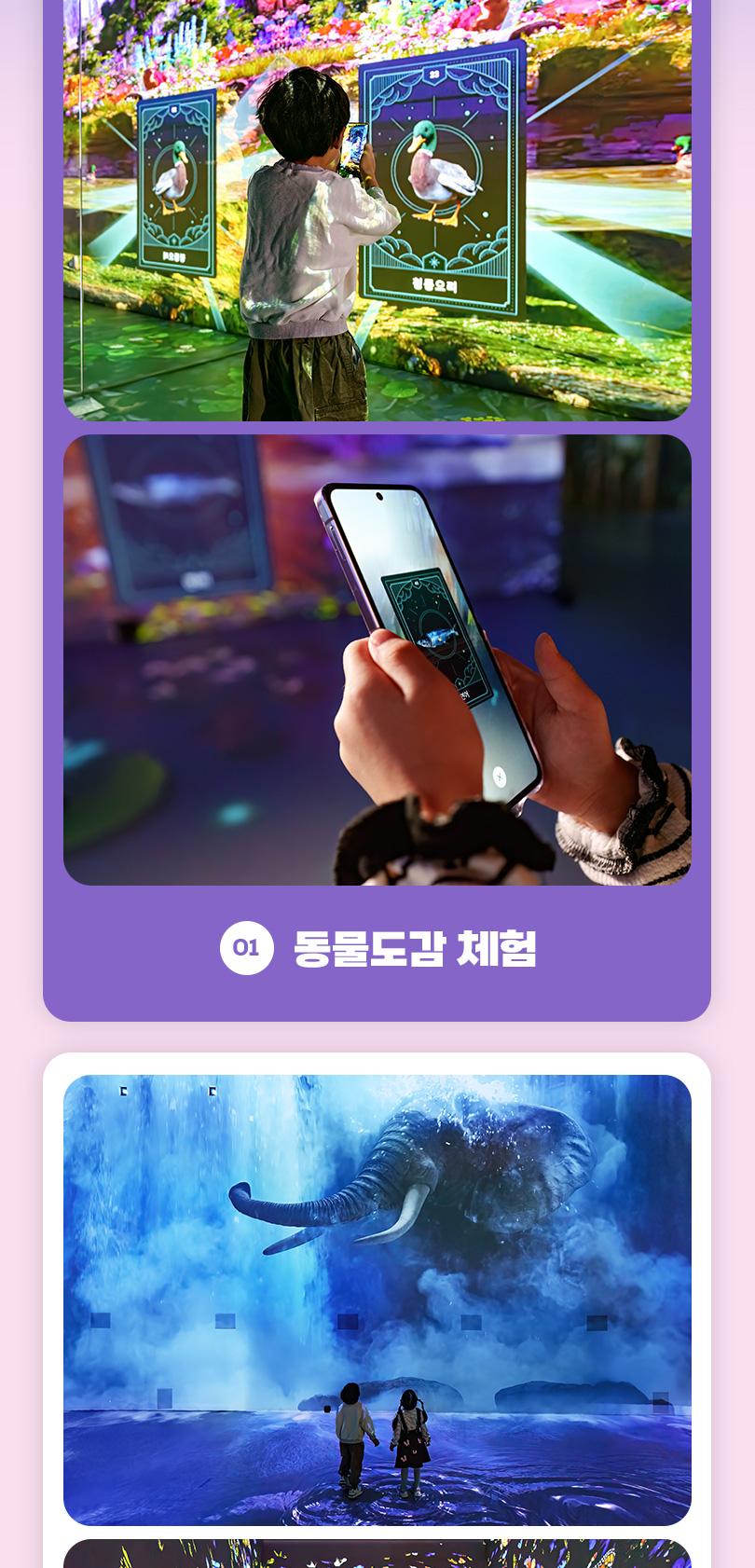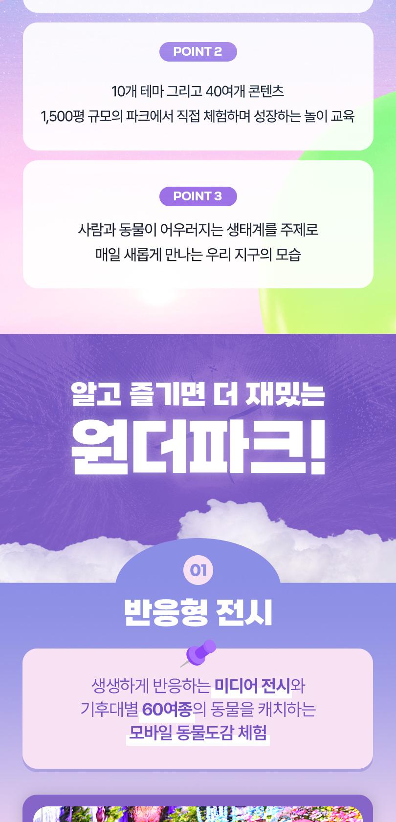 한국어 제공체험형 미디어로 경험하는 살아있는 지구, 과천 서울대공원 내부에 위치한 매직플로우 원더파크를 소개해요. 원더파크는 단순한 놀이 공간이 아닌 교육적 효과도 뛰어난 공간으로 웅장한 미디어 콘텐츠로 46억 년이라는 긴 시간 동안 5차례의 멸종을 겪고도 875만 종이 넘는 생명이 살아가고 있는, 생명력 넘치는 지구를 표현했어요. 위대한 숲부터 놀라운 바다, 우주 속으로 등 1500평 규모로 구성된 10가지 주제의 40여 개의 콘텐츠를 즐겨보세요.