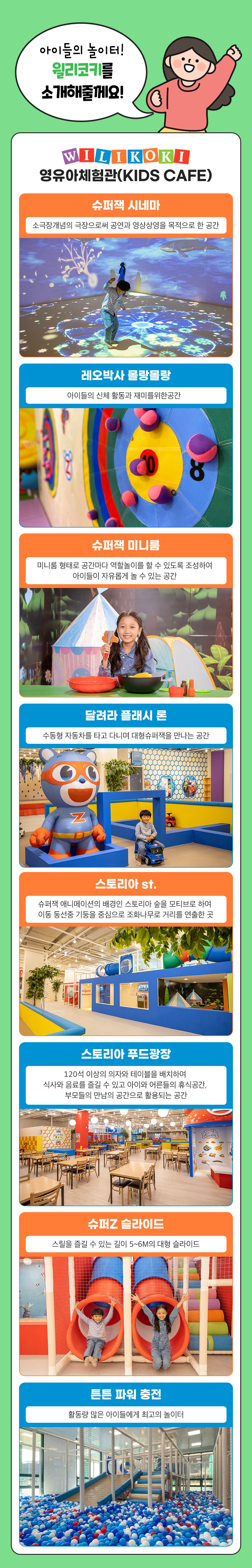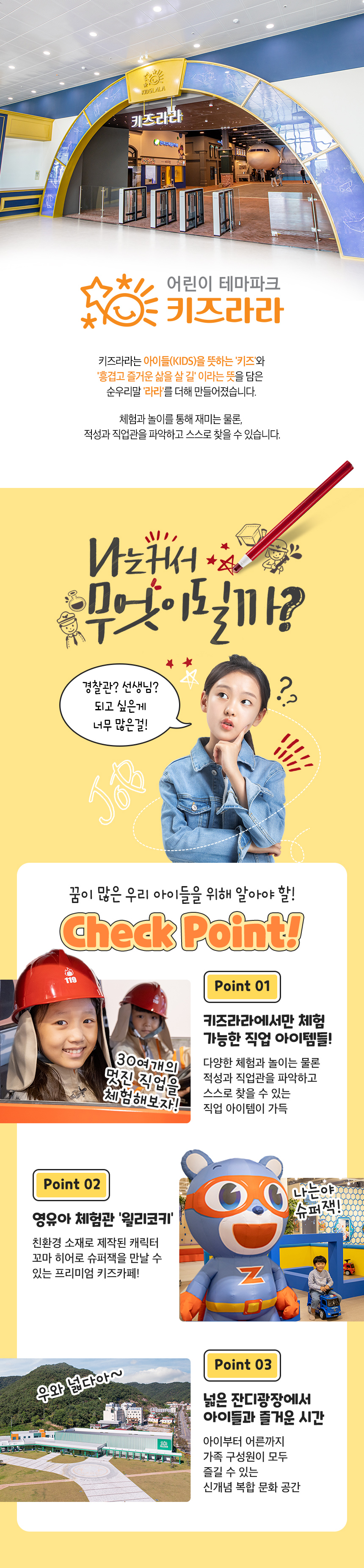 키즈라라는 꿈나무 어린이를 위한 직업체험 키즈파크로 약 30여 개의 직업을 직접 체험해 보며 꿈을 키울 수 있는 공간이에요. 경찰관, 요리사, 승무원, 의사, 파일럿, 기상캐스터 등 직업체험관에서 다채로운 체험을 하면서 재미는 물론 아이들 스스로 흥미와 적성도 찾을 수 있어요. 영유아를 위한 윌리코키 키즈카페, 푸드코트, 잔디광장등 다양한 편의시설도 조성되어 있어 온 가족이 함께 즐길 수 있는 곳이에요.