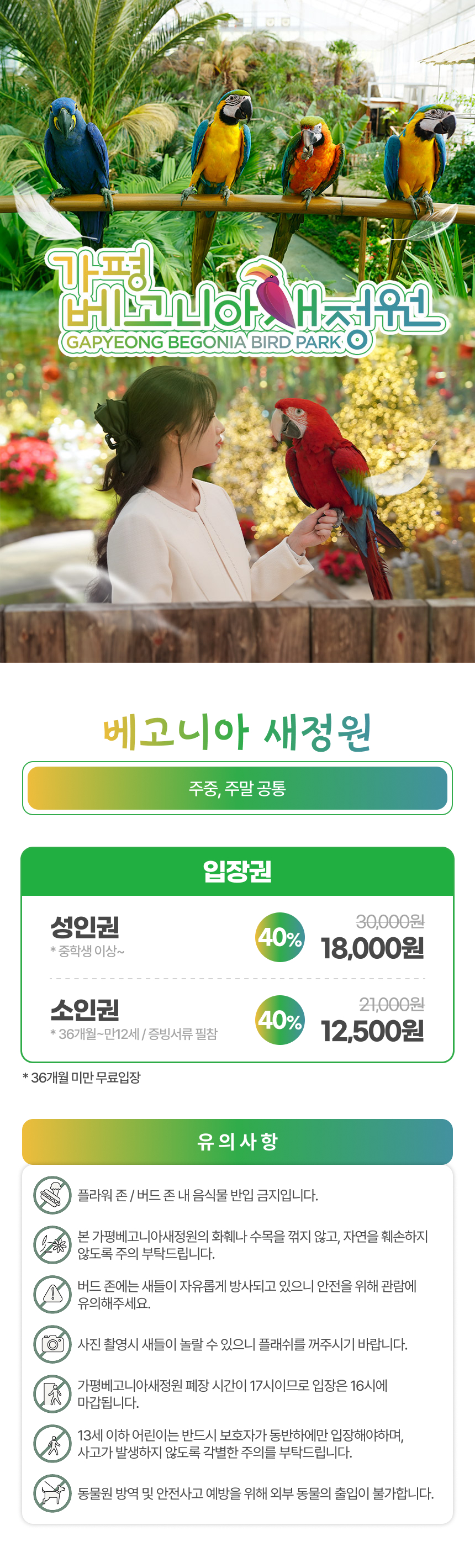 꽃, 새, 정원이 어우러진 초대형 힐링파크, 가평 베고니아새정원을 소개해요. 가평에 약 3만 평 규모로 조성된 베고니아새정원은 사계절 아름다운 꽃과 다양한 새들이 있는 생생한 자연을 만나볼 수 있는 정원이에요. 5개 버드존에 살고 있는 40여 종의 개성 넘치는 새들을 눈앞에서 바라볼 수 있고 8개의 실외 주제정원은 사계절 변화하며 아름다운 모습을 보여줘요. 베고니아새정원의 하이라이트, 베고니아만으로 꾸며진 국내 최대 온실도 놓치지 마세요. 4000여 종의 크고 화려한 베고니아가 여러분을 반겨줄 거예요.
