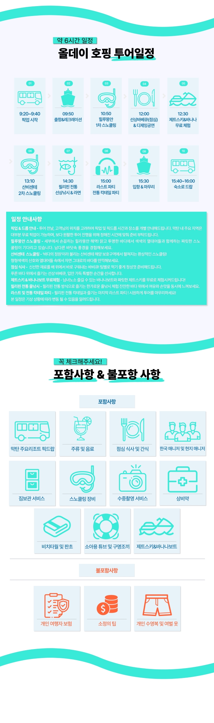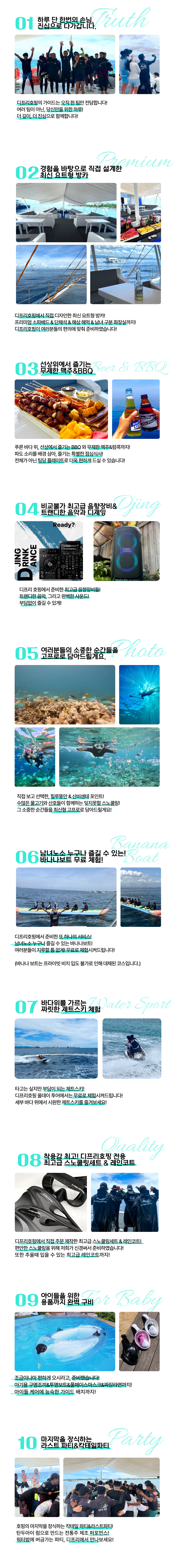 트렌디한 음악과 함께 바다 위를 가르는 짜릿한 무료 제트스키 체험, 그리고 최신형 고프로를 사용해 여러분의 스노클링 장면을 담아드리니 소중한 추억을 오래 기억하기에도 좋아요. 무엇보다 마지막을 장식할 화려한 파티까지! 지금 디프리 호핑에서 만나보세요!