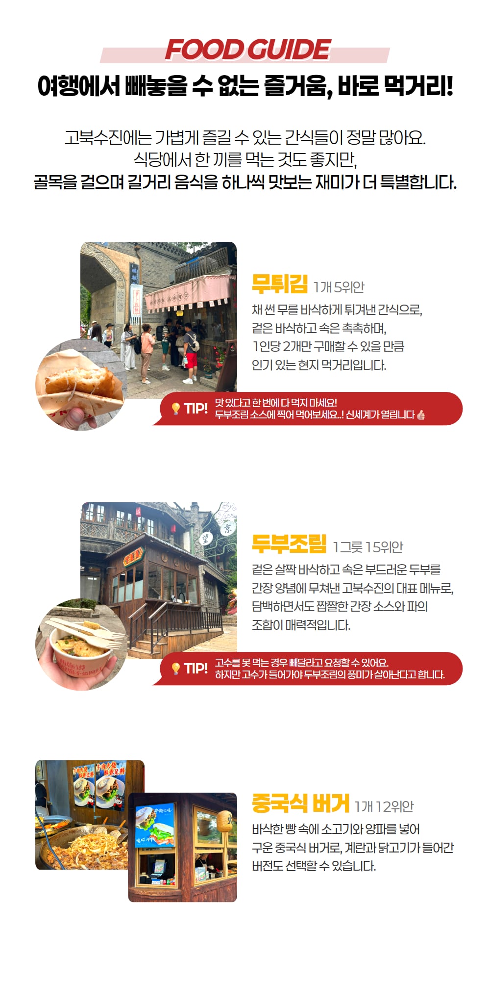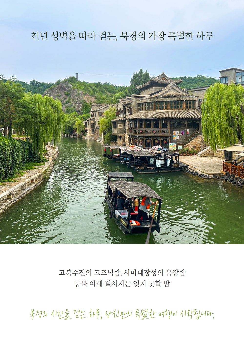 베이징 시내에서 1시간 반, 차를 타고 이동하면 중국의 옛 마을이 상상 속 모습 그대로 눈앞에 펼쳐져요. 인공 수향마을, 고북수진은 상점, 객잔, 가옥 등의 건물을 화북 지역의 건축 양식 그대로 구현해 놓은 곳이에요.