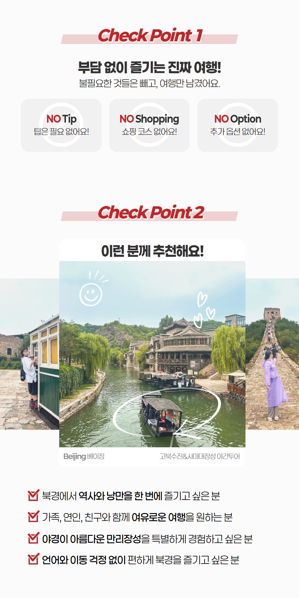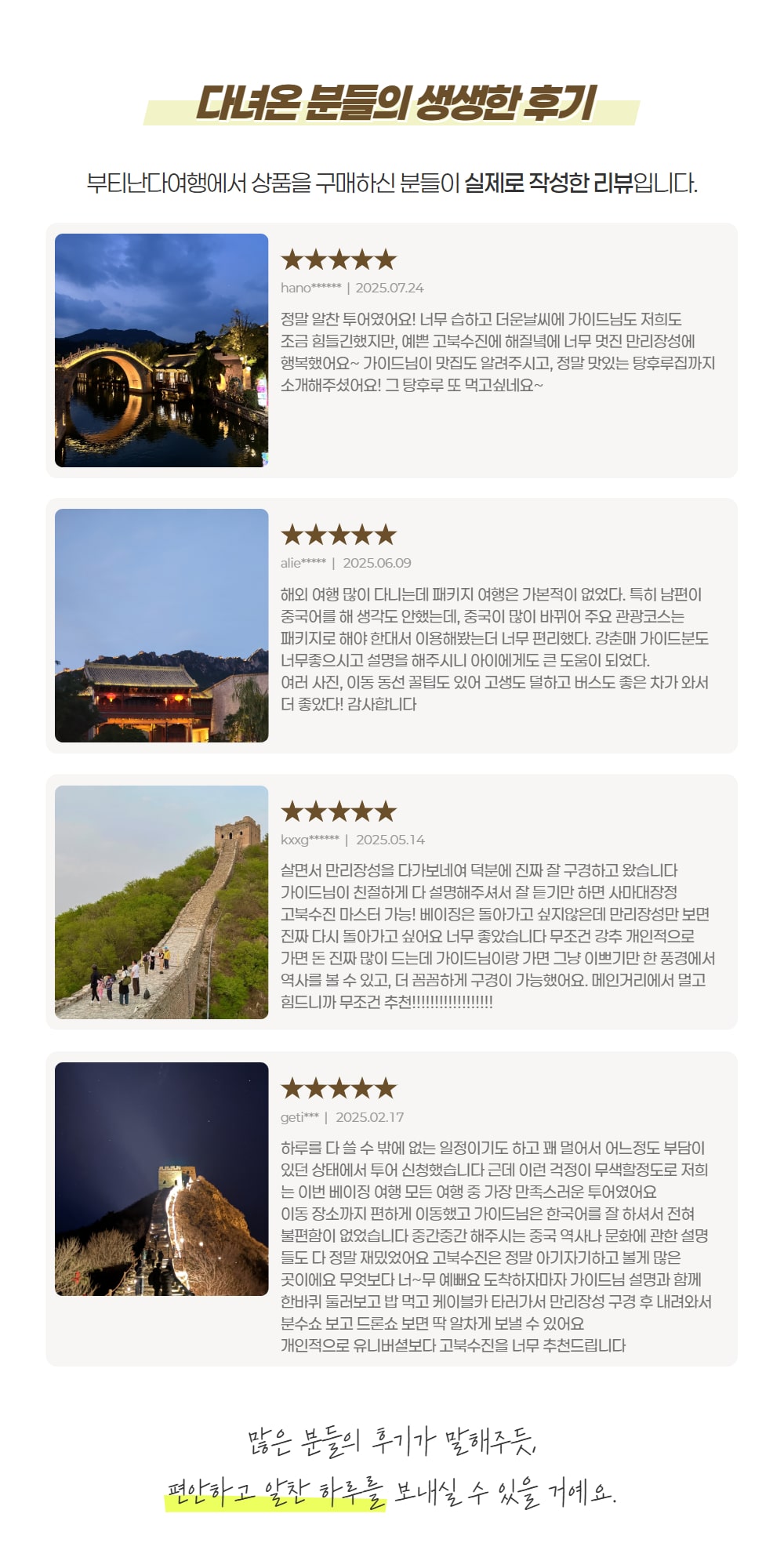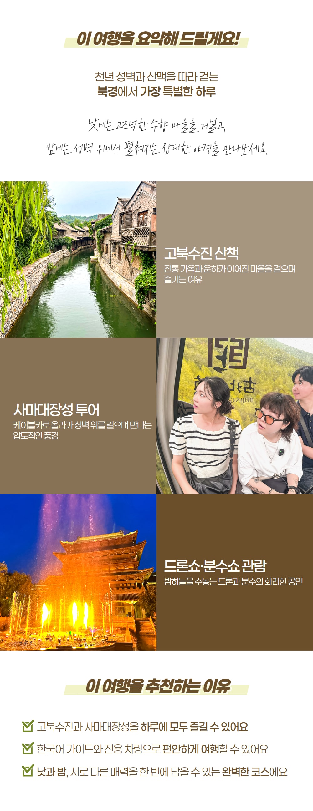 베스트11.25 (화) 정태홍 가이드님과 함께한 고북수진 너무 좋았어요 ! 차타고 가면서 가이드 설명도 너무 잘해주시고 북경 시민이 되기까지 과정 설명해주시는데 너무 신기했어요. 차 번호판도 받는데 어렵다는 말도 신기했네요. “만리장성 중의 최고는 사마대장성”이라는 돌 위에 써있는 글귀를 시작으로 낮의 고북수진 탐방을 잘했고 밤에는 케이블카 타고 올라가 사마장성의 야경을 보고 내려와서 드론쇼도 보았네요. 엄마 모시고 같이 갔는데 너무 좋아했어요~ 부모님 모시고 가도 너무 좋고 고북수진 야경은 정말 끝내줘요 ! 북경 여행오면 필수코스 같고 정태홍 가이드님과 함께해서 더욱 좋았어요~