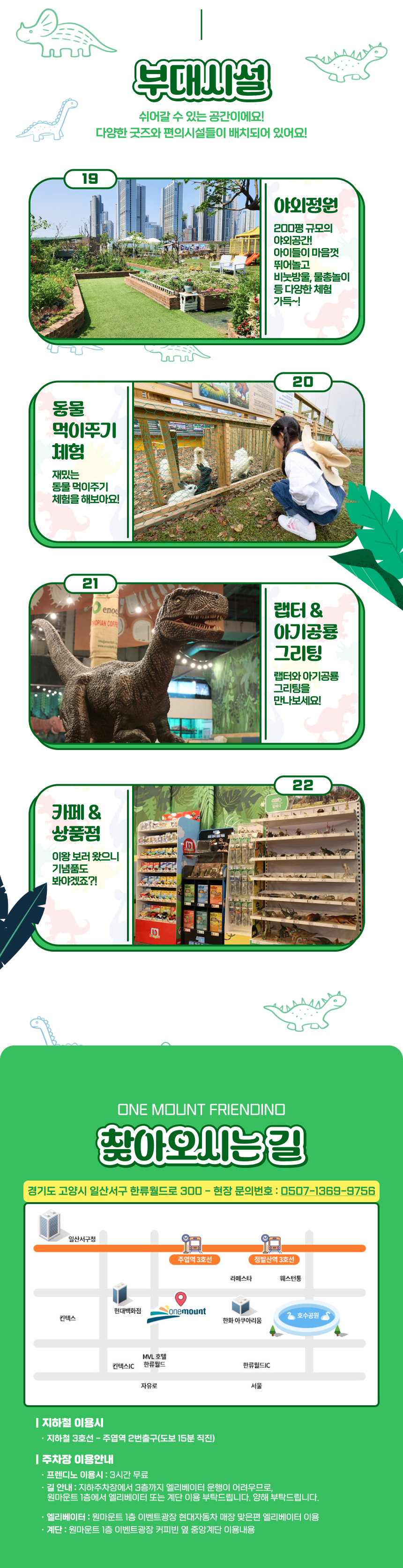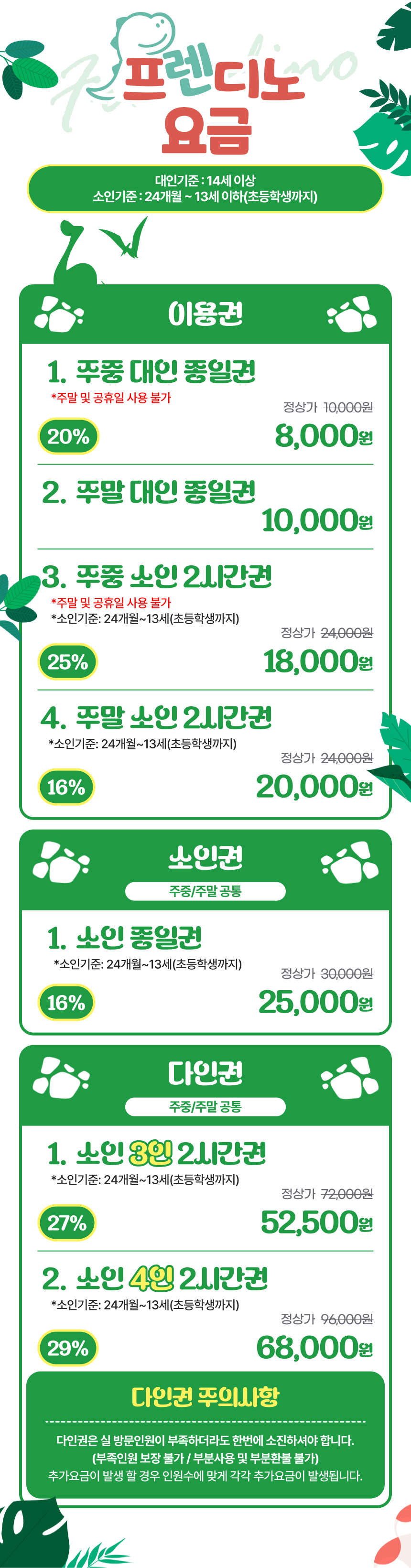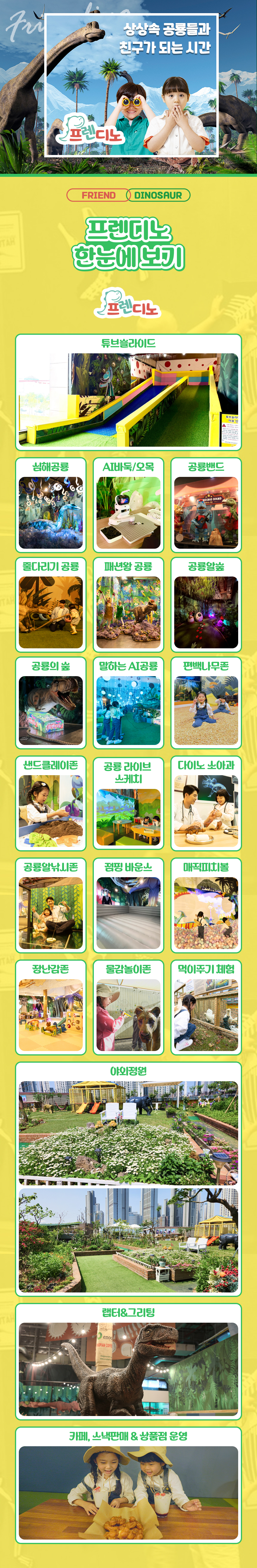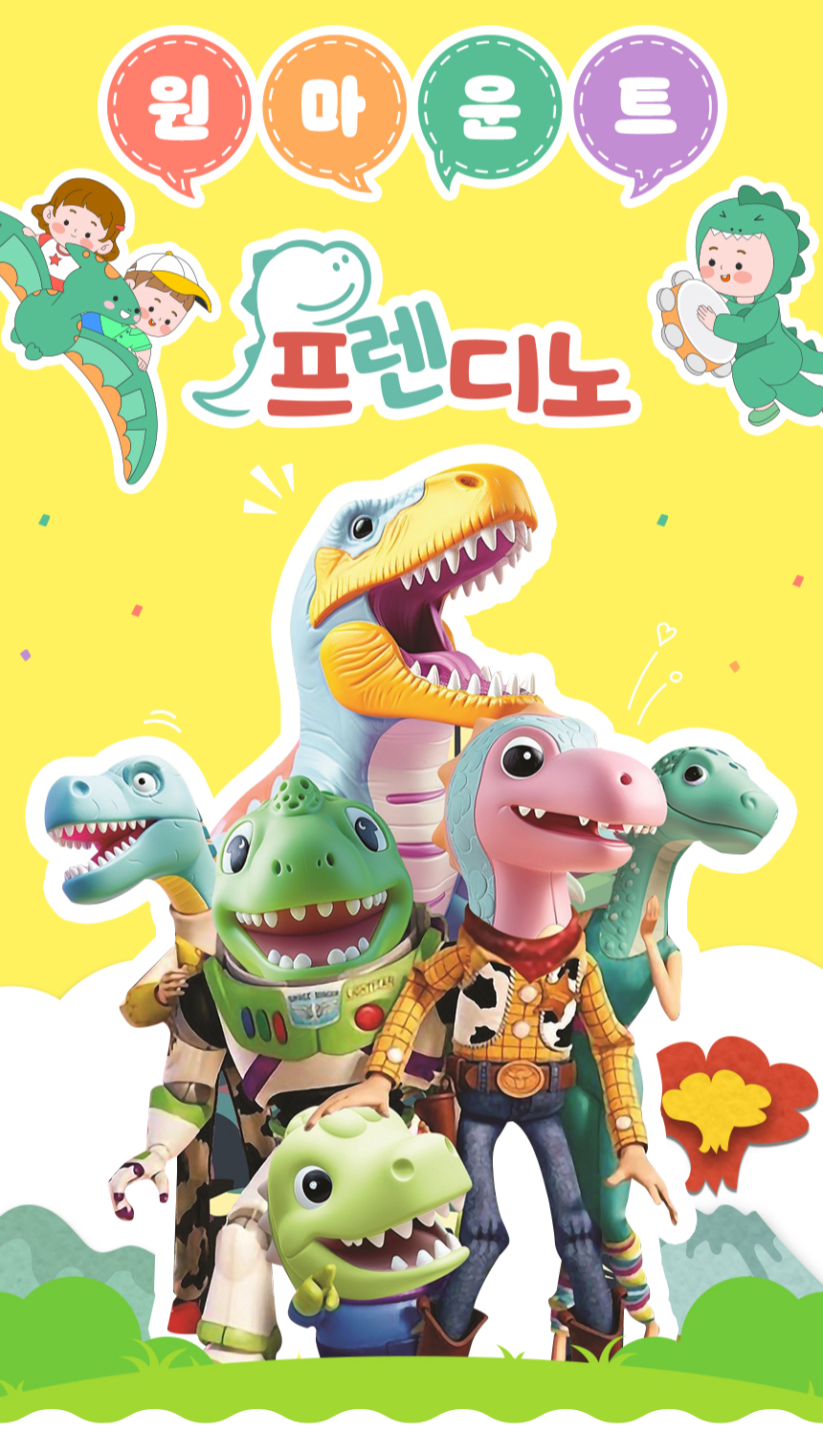 일산 원마운트의 신규 공룡 테마파크, 프렌디노를 소개해요. 프렌디노는 5월 3일 그랜드오픈하는 따끈따끈한 300평 규모의 체험형 공룡 전시 테마파크로 공룡밴드, 패션왕 공룡, 아기공룡병원 등 아이들이 친근하게 다가갈 수 있는 9개의 테마전시관을 비롯하여 인터렉티브 플레이존, 볼풀, 바운스 등 즐길거리가 가득한 공간이에요. 이 외에도 부모님들이 휴식할 수 있는 카페와 다양한 부대시설이 있어요.