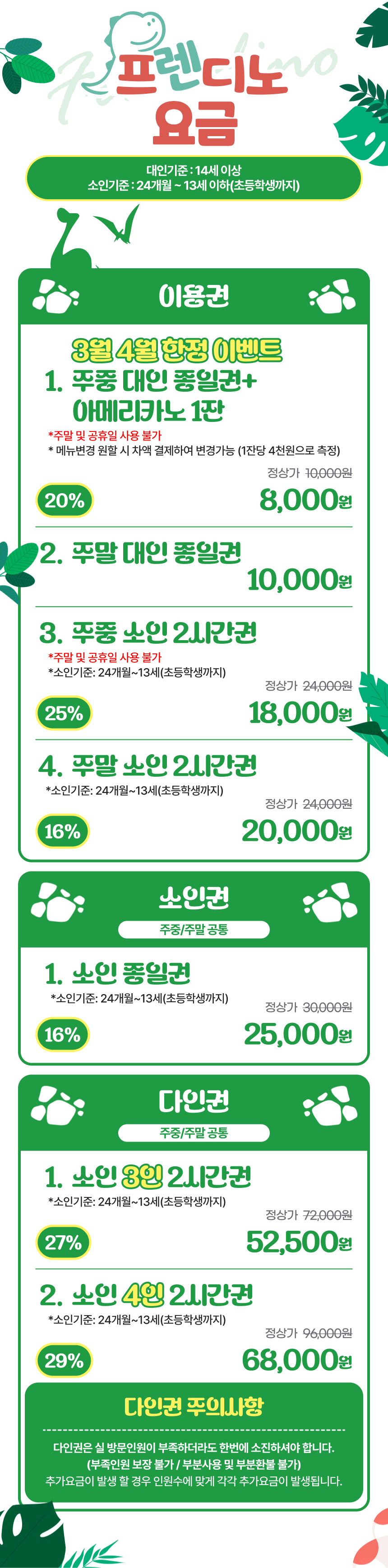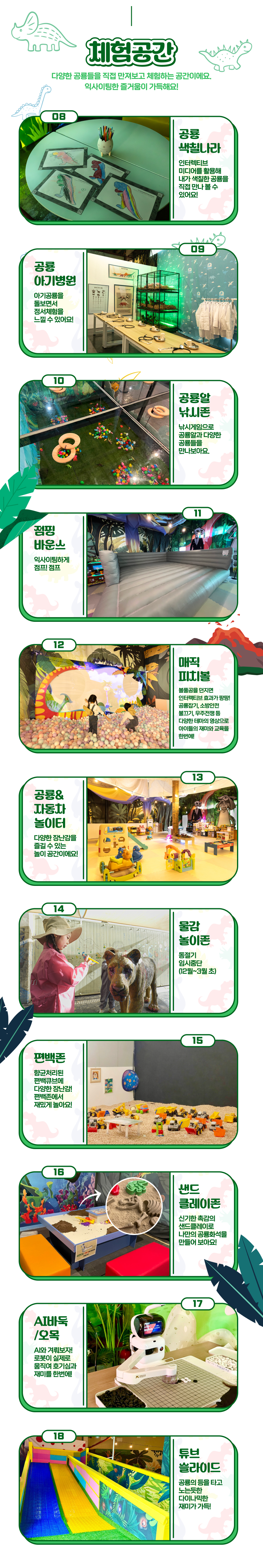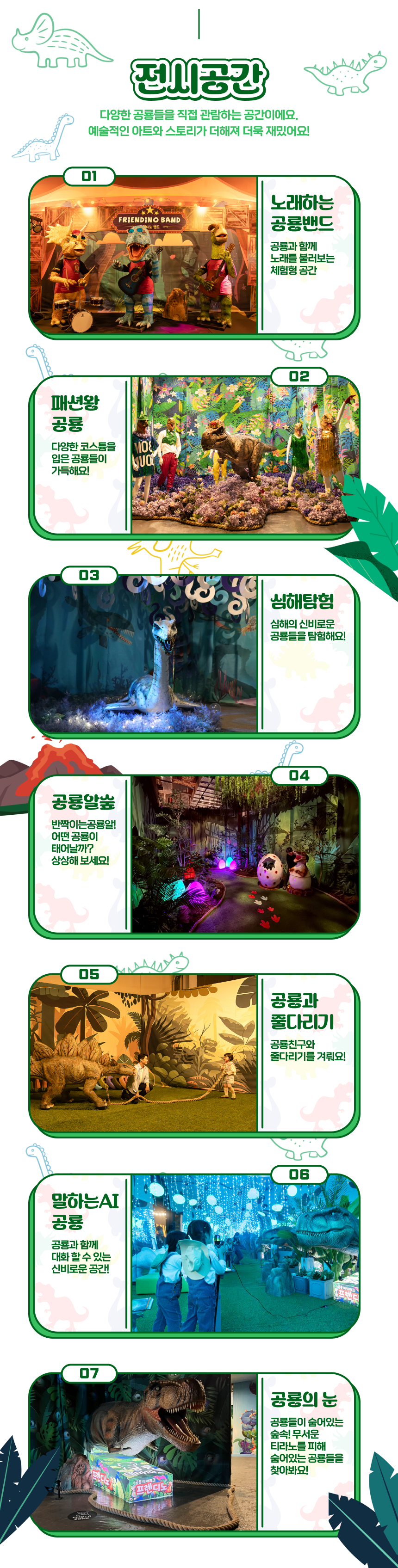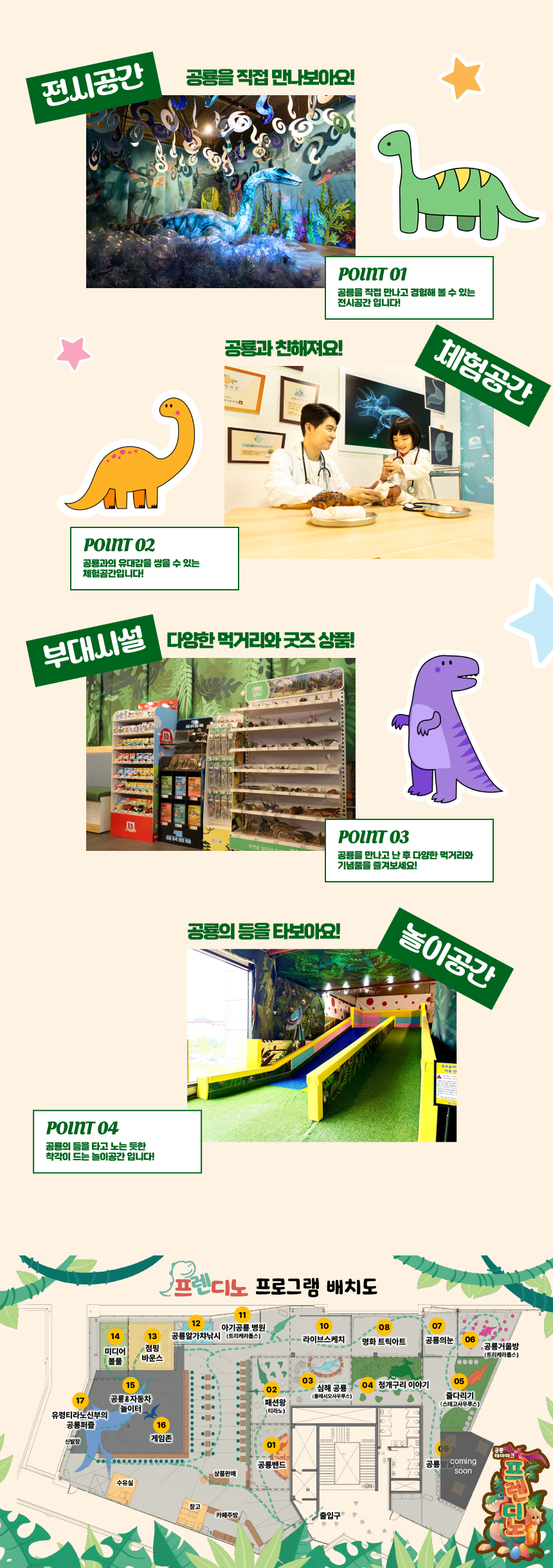 일산 원마운트의 신규 공룡 테마파크, 프렌디노를 소개해요. 프렌디노는 5월 3일 그랜드오픈하는 따끈따끈한 300평 규모의 체험형 공룡 전시 테마파크로 공룡밴드, 패션왕 공룡, 아기공룡병원 등 아이들이 친근하게 다가갈 수 있는 9개의 테마전시관을 비롯하여 인터렉티브 플레이존, 볼풀, 바운스 등 즐길거리가 가득한 공간이에요. 이 외에도 부모님들이 휴식할 수 있는 카페와 다양한 부대시설이 있어요.