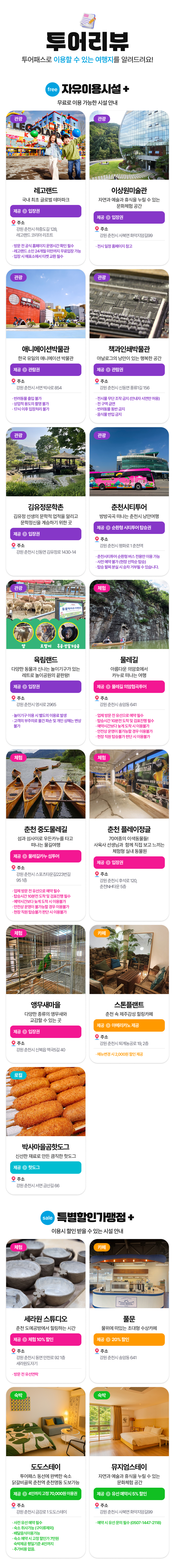 춘천 여행의 필수템! 춘천 투어패스와 함께 즐거운 시간을 보내보세요. 투어패스 하나면 유명 카페와 미술관부터 박물관까지 이용할 수 있어요. 춘천투어패스와 함께 합리적인 가격으로 48시간동안 알찬 여행을 즐겨 보세요!