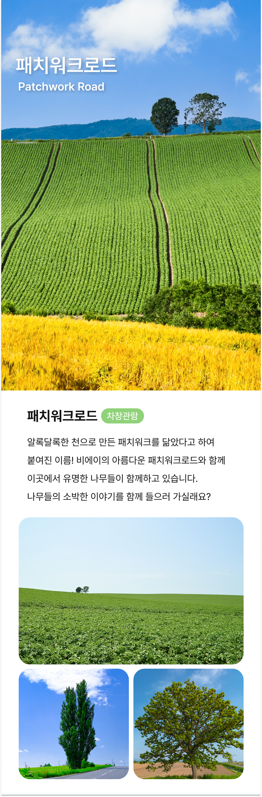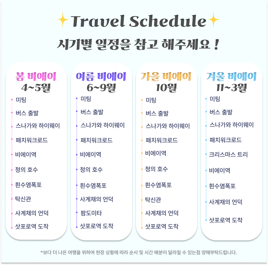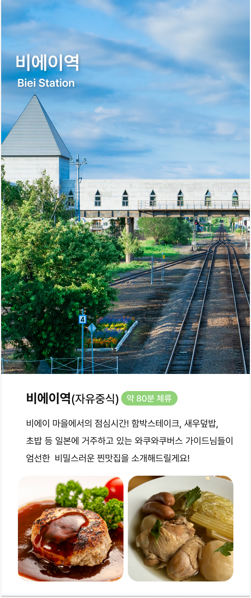 베스트12/19 욘사마 가이드님 투어 했어요 :) 닝구르 안가는 투어를 원했고, 너무 이른 출발보다는 8시 이후 투어로 알아보았어요 ! 개인적으로는 비에이에서 2시간정도 주고, 사계채 안가고 일찍 돌아왔으면 좋겠는데, 그런투어는 아쉽게도 없더라구요 ㅠㅠ 비에이 투어가 두번째인데, 이번에는 가족들과 함께 투어했어요! 운 좋게도 이용객수가 딱 좋아서 편하게 투어 했고, 날씨도 너무 좋아서 멋진모습 많이 볼 수 있어 좋았습니다 ㅎㅎ 가이드님도 사진도 열정적으로 찍어주시려고 하셔서 감사했어요 - 소소한 지식들을 많이 알려주셔서 재밌었고 중간 퀴즈도 재밌었어요 ㅎㅎ 간식으로 주시는 감자 쫑맛탱!!! 고민하시고 계시다면 추천드립니다 !