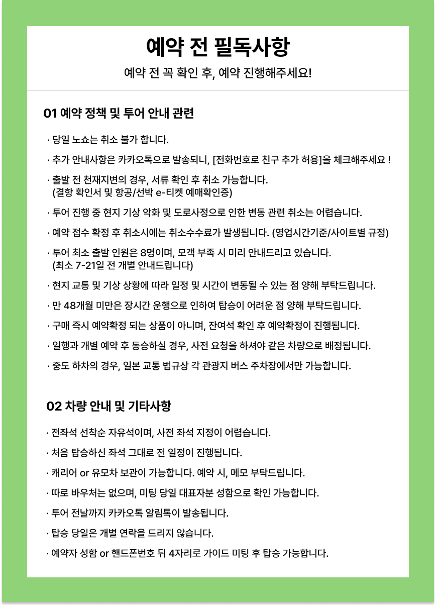 한국어 제공🚌신나게 떠나는 와쿠와쿠 버스 투어🚌 ❤️와쿠와쿠버스에서만 드리는 혜택❤️ ✨관광지로 달려가는 길 지루하지 않게 진행되는 365퀴즈 이벤트✨ ✨재방문 고객님께 드리는 소소한 지역 특산 선물✨ ✨특별제작 QR맛집지도 제공 및 돈키호테 할인 쿠폰 제공✨ 상품 구매자 전원에게 일본 빅카메라 7% 할인 쿠폰을 드려요! 쿠폰은 구매내역 페이지에서 다운로드 가능합니다. 상품 구매자 전원에게 일본 사츠도라 5% 할인 쿠폰을 드려요! 쿠폰은 구매내역 페이지에서 다운로드 가능합니다. 상품 구매자 전원에게 일본 돈키호테 최대 15% 할인 쿠폰을 드려요! 쿠폰은 구매내역 페이지에서 다운로드 가능합니다.