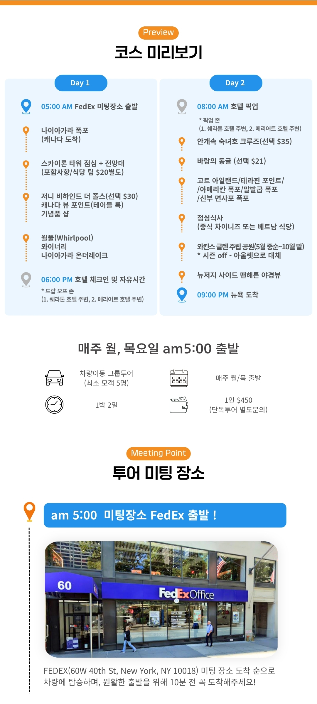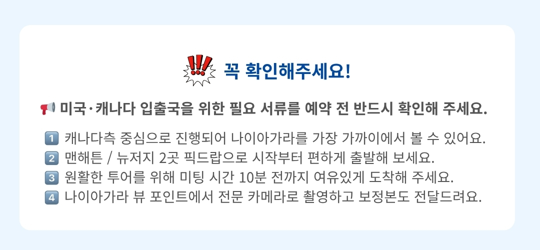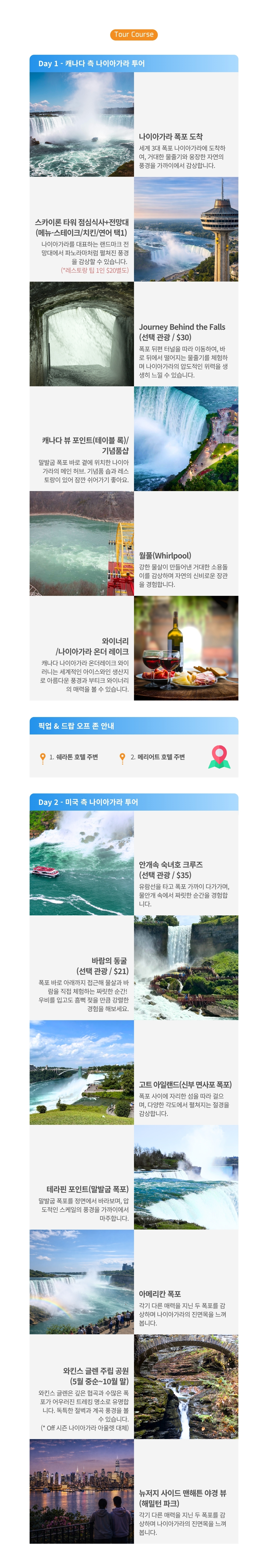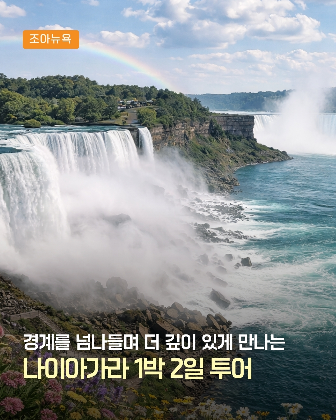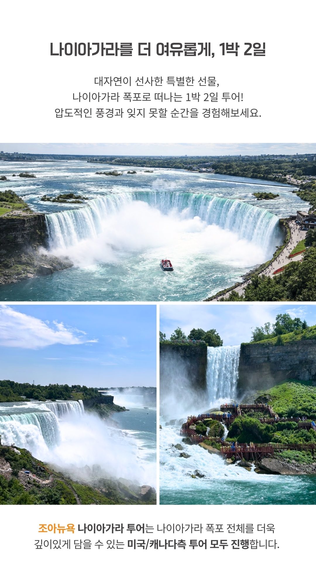 계절마다 다른 매력을 가지고 있는 나이아가라 폭포는 봄과 여름에는 싱그러운 자연과 시원한 물줄기를, 가을에는 알록달록한 단풍의 모습을, 겨울에는 얼어붙은 폭포의 환상적인 모습을 감상할 수 있어 전 세계 사람들이 사랑하고 꼭 방문하고 싶어하는 장소예요. 미국과 캐나다의 국경을 따라 흐르고 있는 이 폭포는 단순히 자연경관을 감상하는 경험을 넘어 평생 잊지 못할 풍경과 더불어 엄청난 물 소리를 자랑해 시각적으로도 청각적으로도 놀라운 경험을 할 수 있어요. 이러한 나이아가라 폭포를 뉴욕에서 출발해 1박 2일동안 보다 여유롭게 방문해 보세요. 나이아가라를 감상했던 경험은 미국 여행에 있어 놀랍고 기억에 남을 시간이 될 거예요!