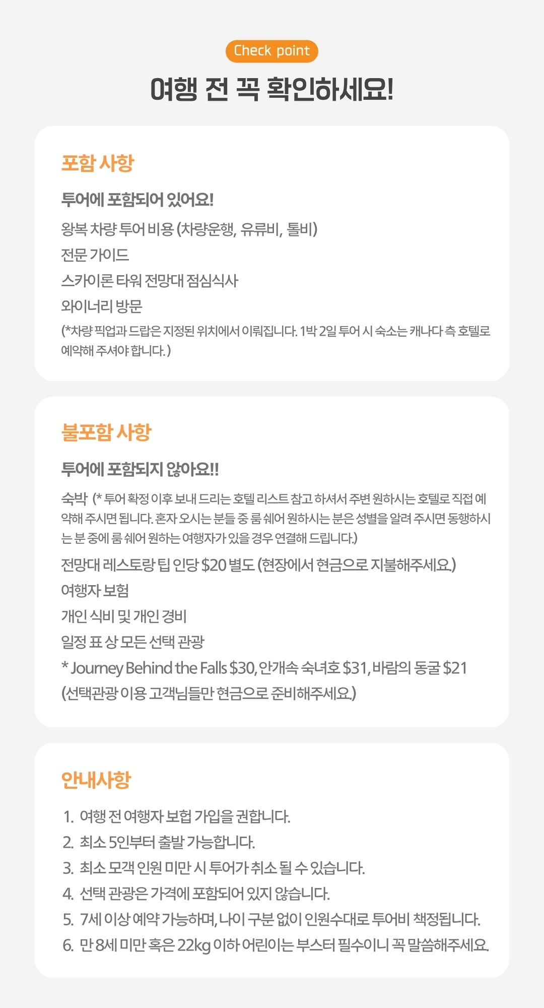 베스트이동시간이 매우 길지만 가볼만한 투어입니다. 시간 여유가 되신다면 당일투어보단 꼭 1박을 추천합니다. 나이아가라에서 여유롭게 보내는 밤과 아침시간이 굉장히 좋았습니다. 평화로운 산책로와 폭포가 아직 기억에 남습니다. 가이드님이 일정 전반에 세세한 사항까지 안내하고 잘 챙겨주십니다. 보스턴 투어 함께 했던 김중민 가이드님을 또 만났는데 유쾌하고 즐거웠습니다. 숙박 불포함이라 직접 호텔 예약해야 되어서 불편하다고 생각했는데 결과적으론 캐나다쪽 좋은 호텔에 묵어서 비쌌지만 만족도는 높았습니다. 캐나다쪽 풍경도 꼭 보시길. 그리고 바람의 동굴 선택관광은 팀중에서 저혼자 했지만 만족도 최고였습니다! 크루즈도 좋지만 저는 폭포 바로 옆에서 물맞는게 더 신나는 체험이었습니다. 동그란 무지개를 볼수있어요!