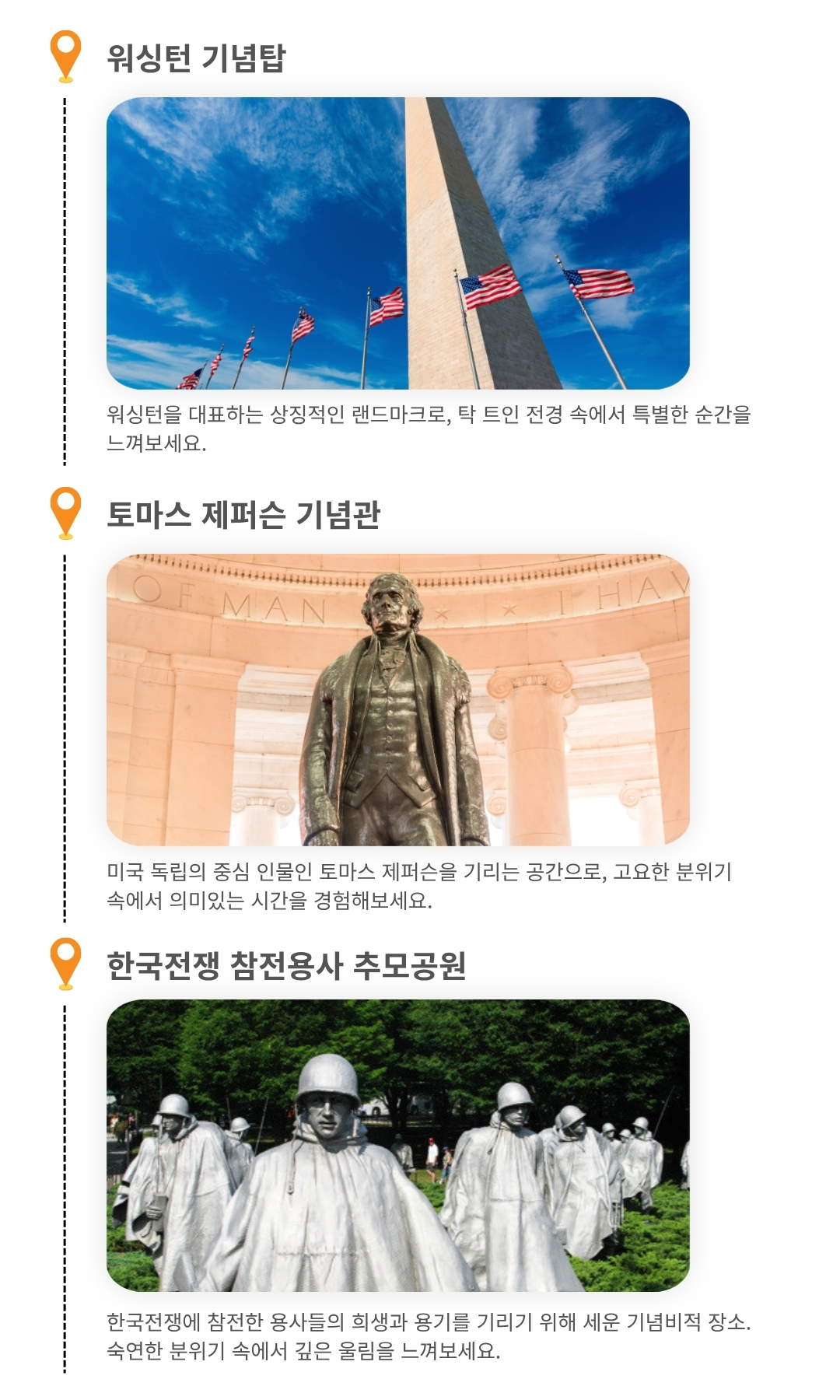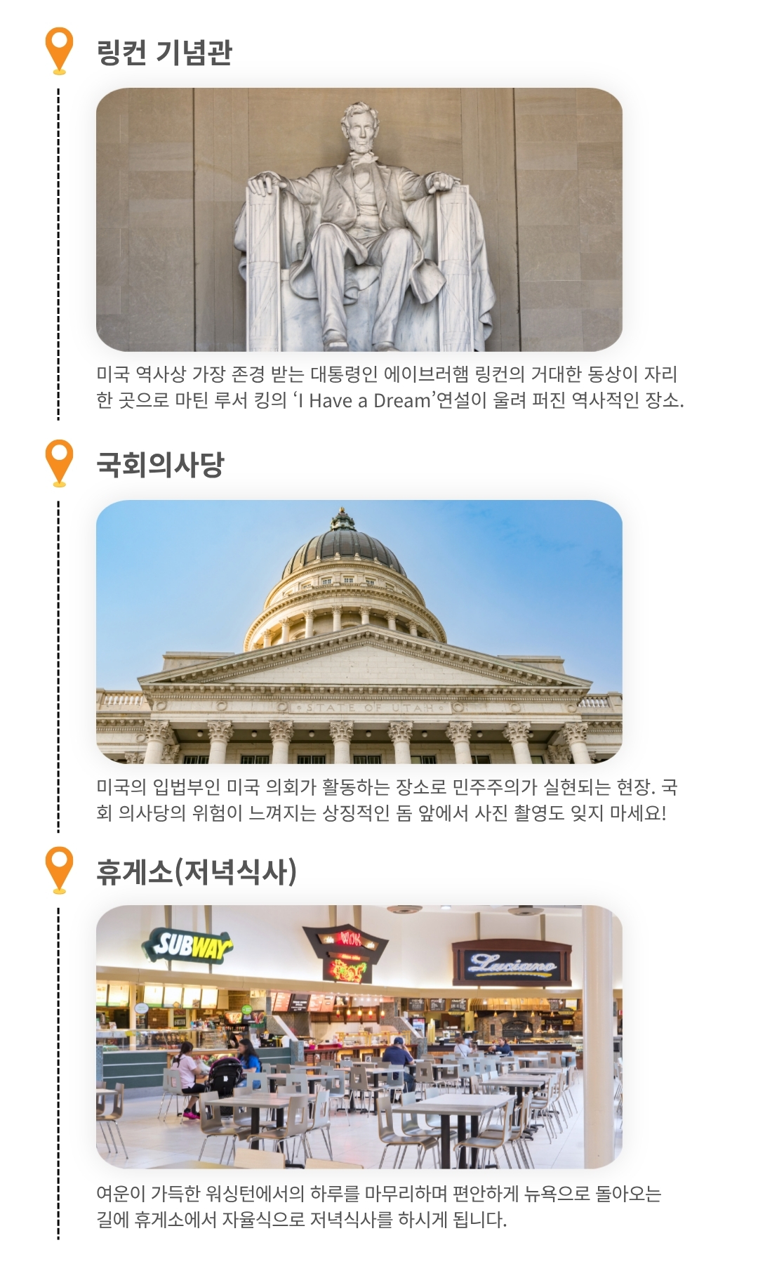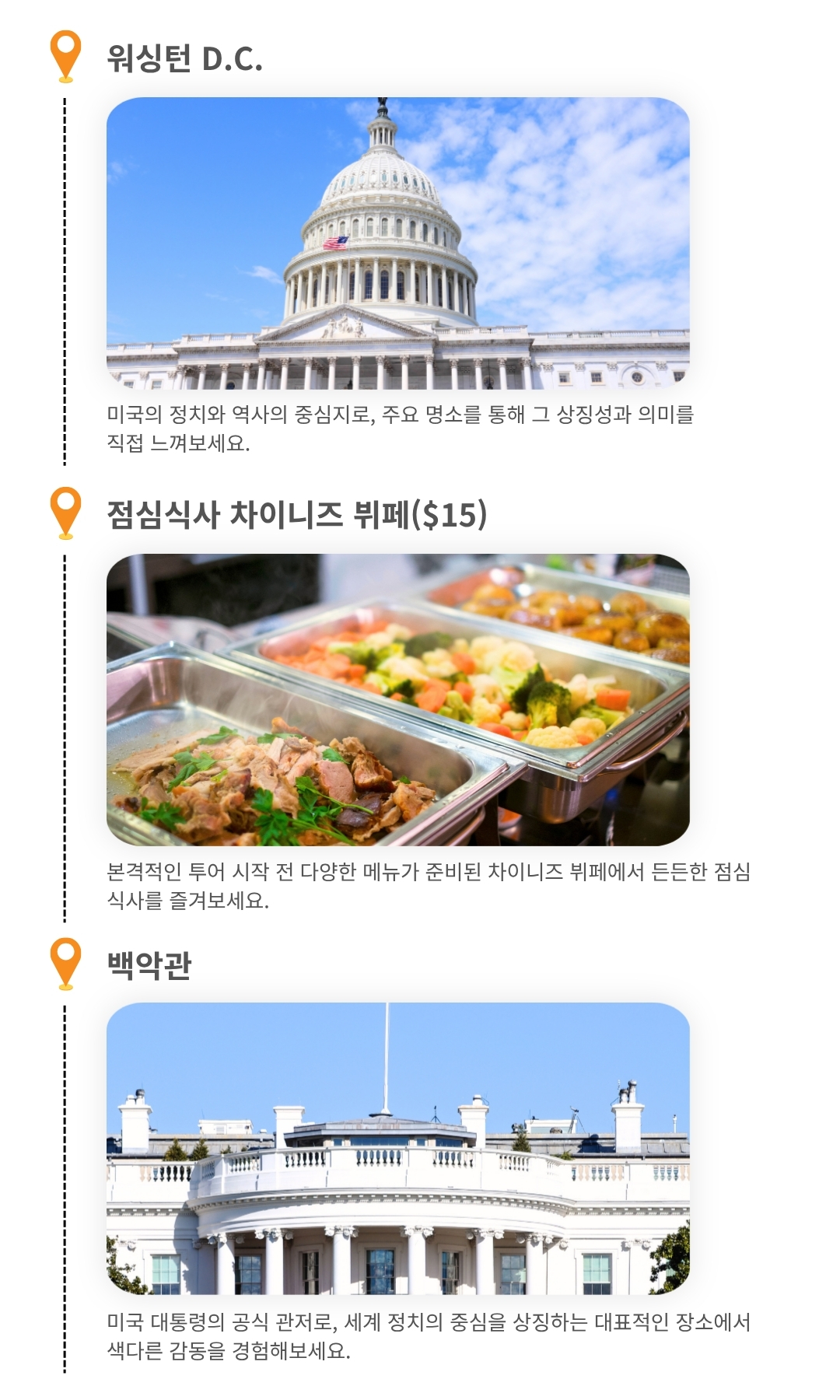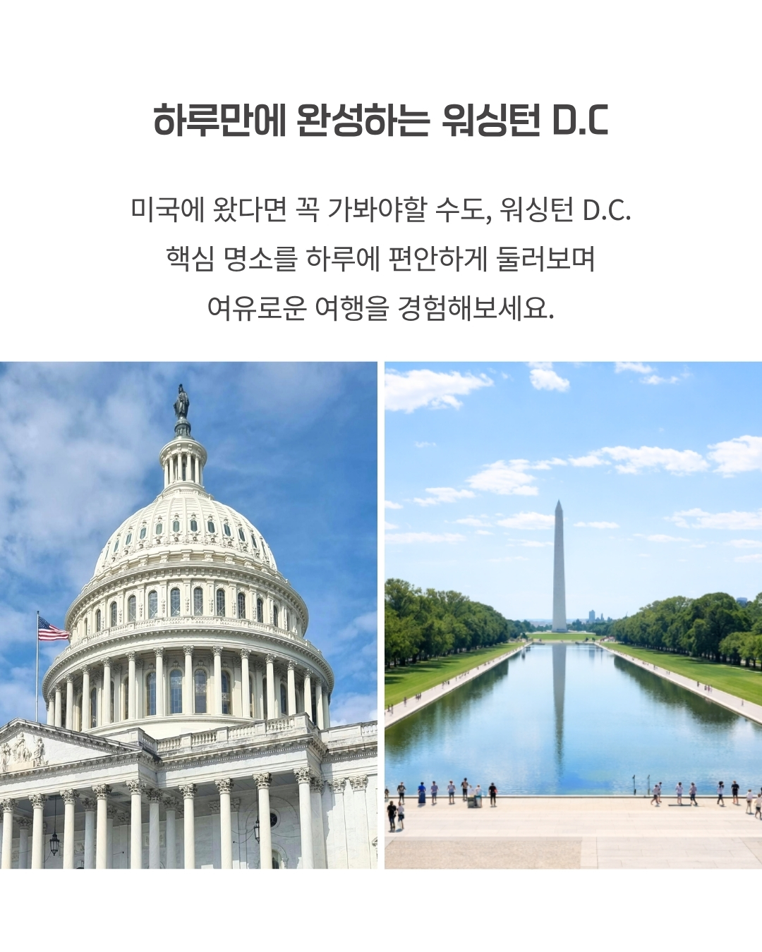 미국의 수도이자 역사, 문화, 정치의 중심지인 워싱턴 DC를 당일치기 전일투어로 만나보세요! 미국 여행에서 빼놓을 수 없는 워싱턴 DC, 뉴욕에서 먼 거리와 제한된 일정때문에 워싱턴을 방문하기 망설이셨던 분들을 위해 준비했어요. 하루 당일 여행으로 진행되는 코스이며 자유여행과 패키지 투어의 장점만 모아 진행돼요. 편안하게 전용 차량을 타고 이동하며 워싱턴의 주요 핵심 스팟들만 쏙쏙 골라서 방문하니, 하루 동안 알찬 워싱턴 여행을 즐길 수 있어요! 미국의 다채로운 분위기를 느끼고 싶은 분들은 워싱턴 투어를 놓치지 마세요!