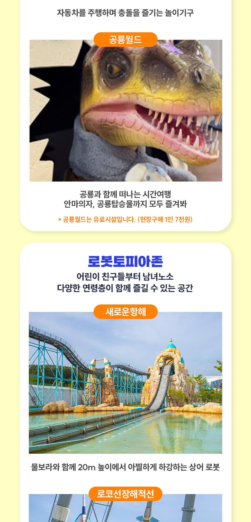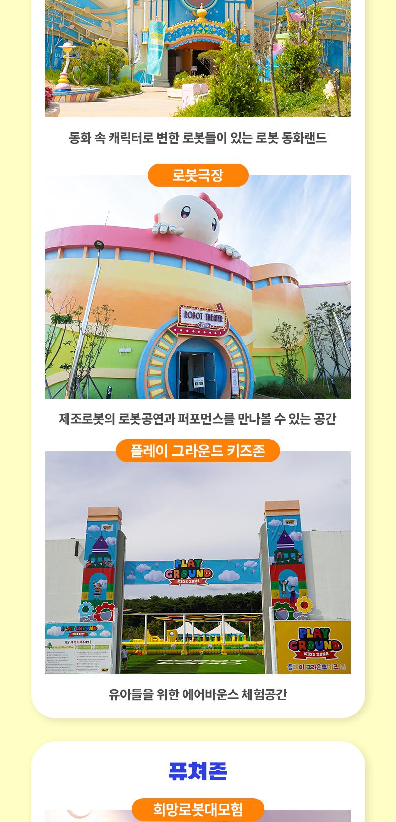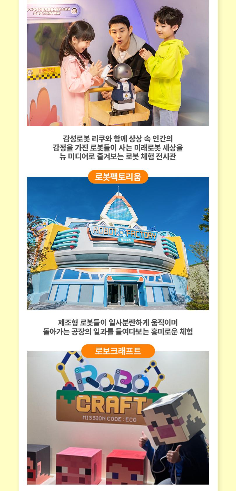 로봇랜드는 세계 최초의 로봇 테마파크로 회전목마, 롤러코스터 등의 짜릿한 22개 놀이기기구는 물론 기존 테마파크와는 차별화된 미래에서 온듯한 다양한 로봇이 있는 11개의 로봇 체험관람시설이 있어 남녀노소 모두 알찬 하루를 보낼 수 있어요. 주말에는 다양한 행사와 불꽃놀이까지 준비되어 있어 가족 나들이로 최적의 공간이에요.