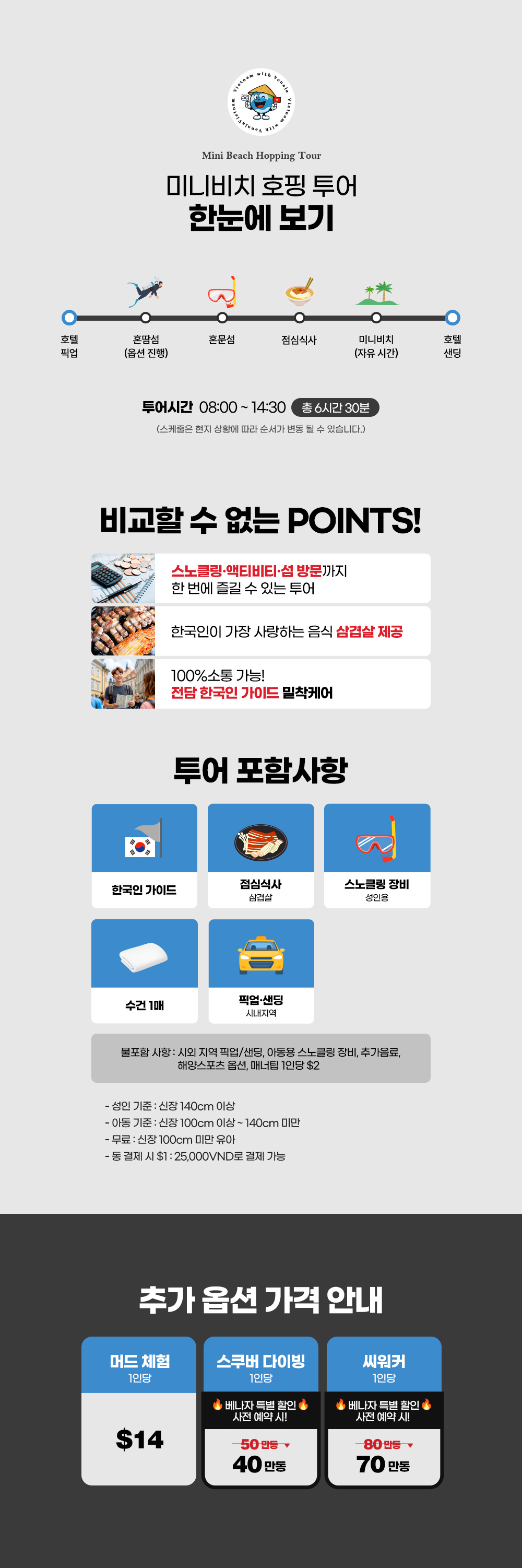 해당 투어는 점심 식사를 즐길 수 있는 혼문 섬 방문이 포함된 일정으로, 아름다운 미니비치에서 자유 시간을 보내며 여유롭게 힐링할 수 있어요. 또한 2곳의 호핑 포인트에서 스노클링을 즐기며 투명한 바닷속 풍경을 만끽할 수 있는 알찬 투어예요.