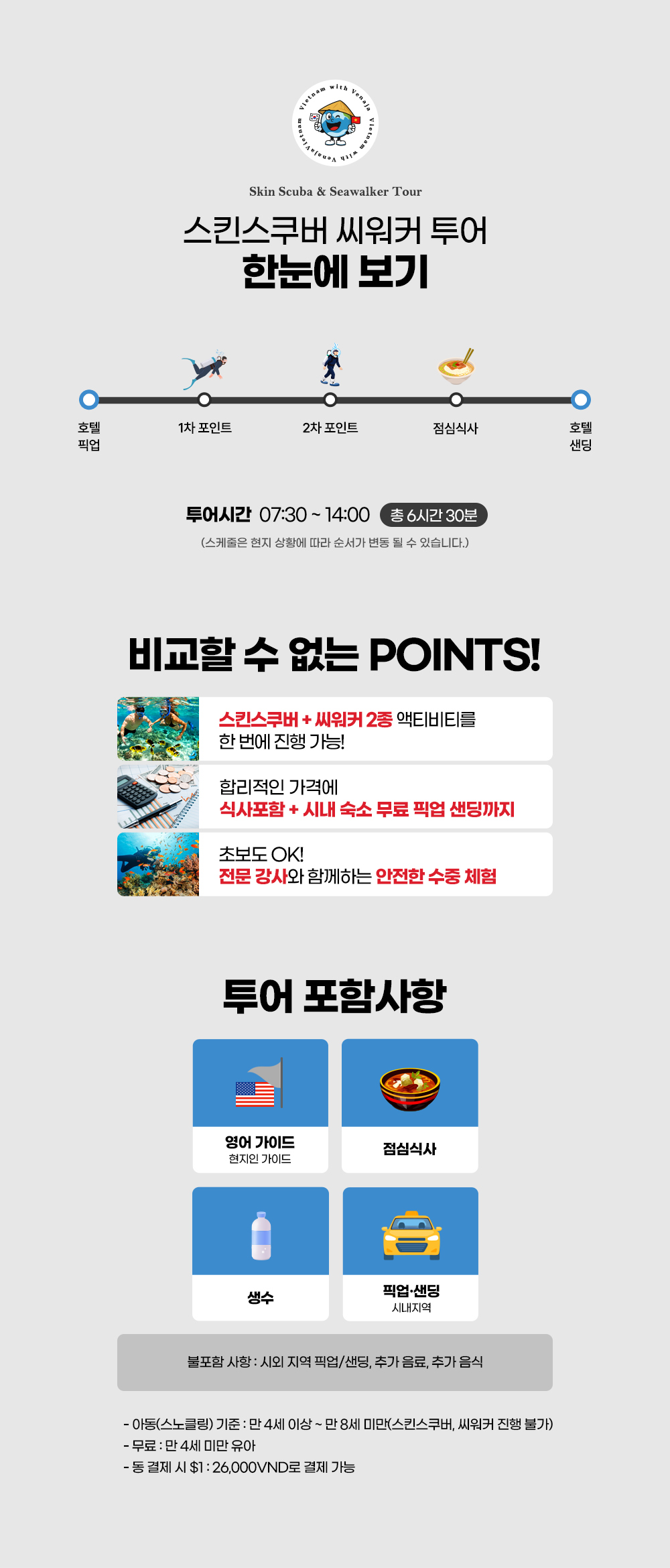 물론 당일 현장에서 스쿠버나 씨워커에 거부감이 드는 분들을 위해 스노클링 장비도 구비해 놓고 있어, 한층 넓어진 선택지로 마음에 쏙 드는 해양 액티비티를 진행해 보실 수 있을 거예요.