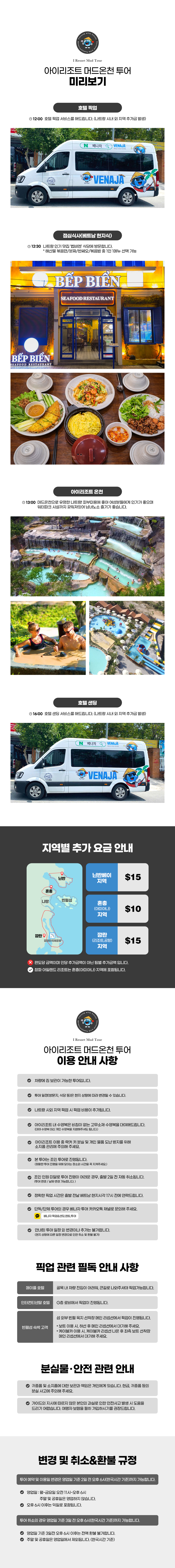 오후 12시쯤 여유롭게 출발해, 약 4시간 동안 아이리조트에서 짧고 굵은 힐링 타임을 즐겨보세요! 베트남 자유 여행 전문 투어사 '베나자'에서 진행하는 본 투어는, 피부 미용에 좋은 머드 온천과 아이리조트 워터파크를 모두 즐길 수 있는 상품이에요.