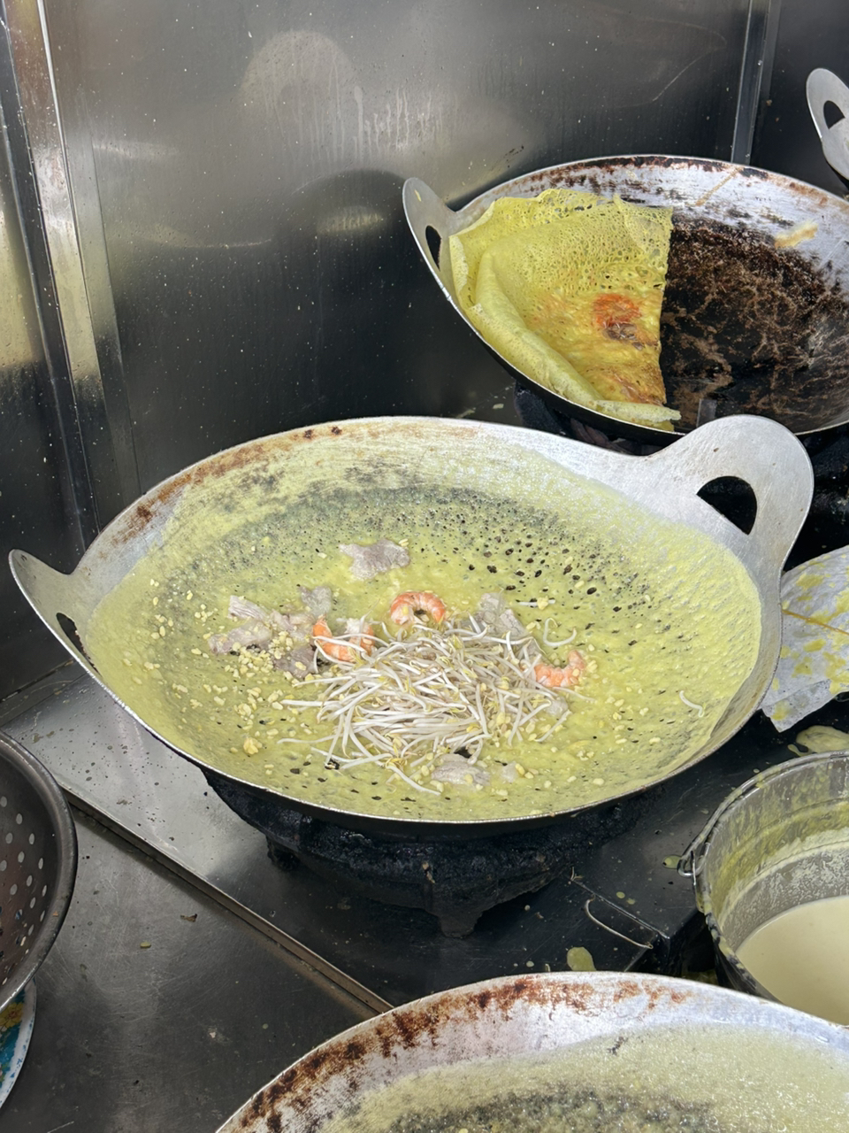 노란 쌀가루 반죽물에 채소와 해산물 등을 넣어 크레페처럼 얇게 부친 베트남 전통 음식이에요.