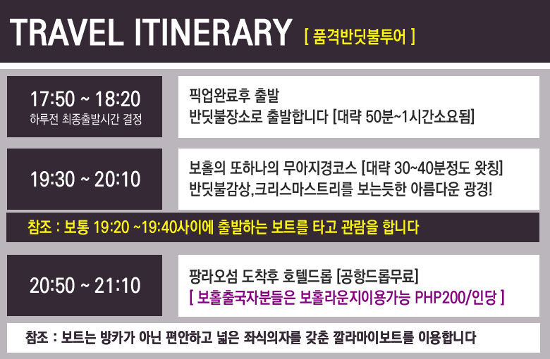 '렛츠고보홀 대기 없는 고품격 반딧불 투어'는 오후 6시 전 보홀의 청정 구역인 로아이강으로 출발해, 30 - 40분 정도 반딧불을 구경하고 호텔로 돌아오는 일정의 투어예요. 다른 추가 사항 없이 깔끔하게 반딧불만 보고 오기 때문에, 저녁 시간을 너무 많이 할애하고 싶지 않은 분들께 추천해 드려요.