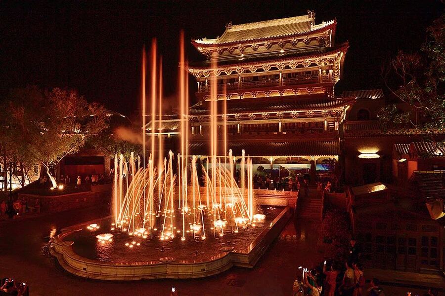 분수쇼는 커다란 고택 전체를 감싸는 미디어 파사드와 함께, 음악에 맞춰 화려한 물줄기를 내뿜어 시선을 사로잡는 쇼예요. 고대의 모습을 담은 고북수진에 현대적 기술이 더해진 미디어 파사드 고북수진 야경의 하이라이트이기도 해요.