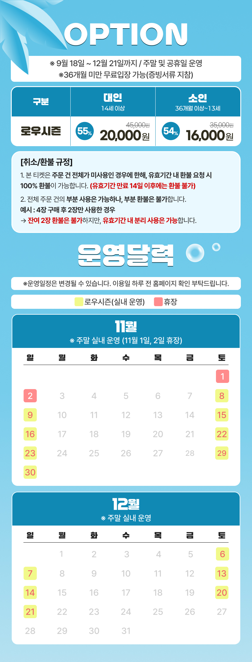 실내시설 : 로우시즌 동안 주말 및 공휴일 운