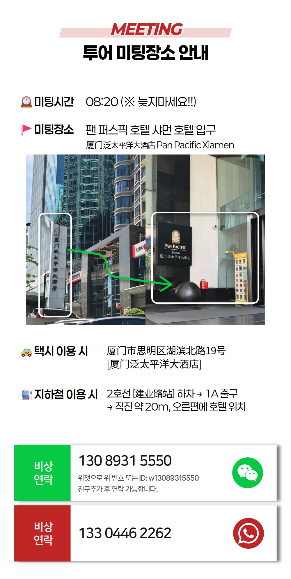 - 택시이용 주소지(중문주소) : 厦门市思明区湖滨北路19号[厦门泛太平洋大酒店]
