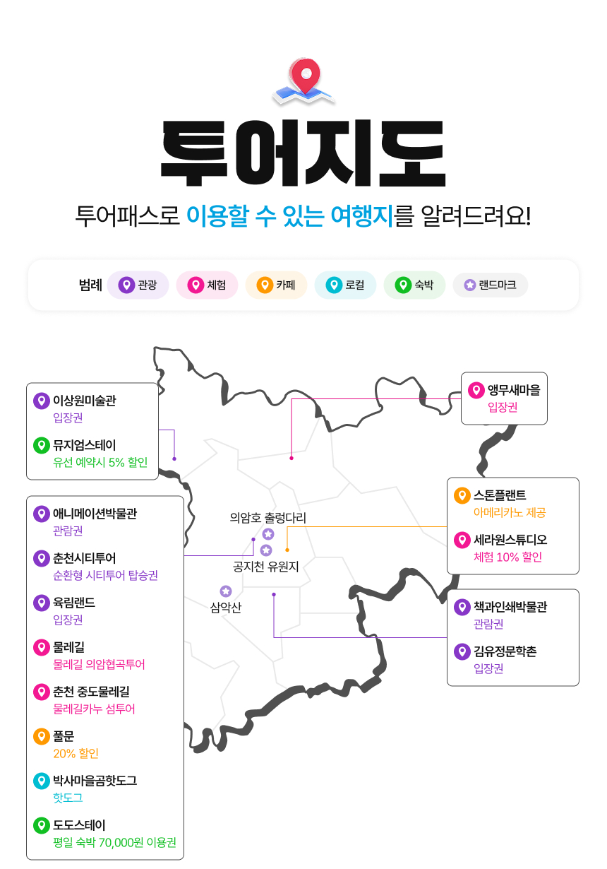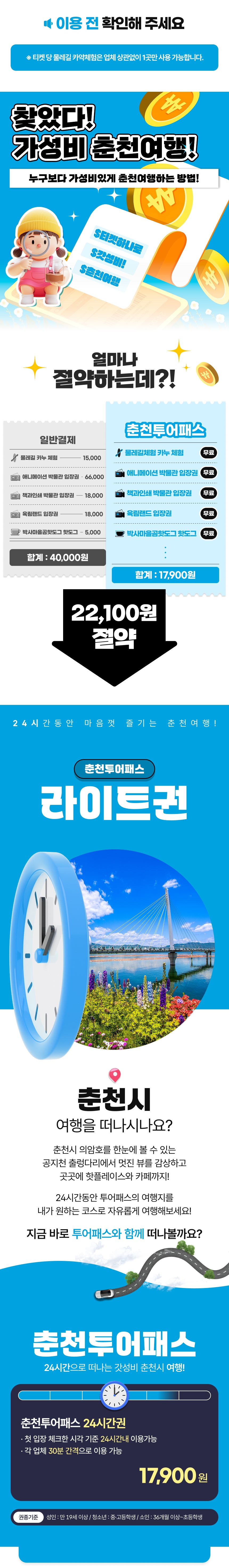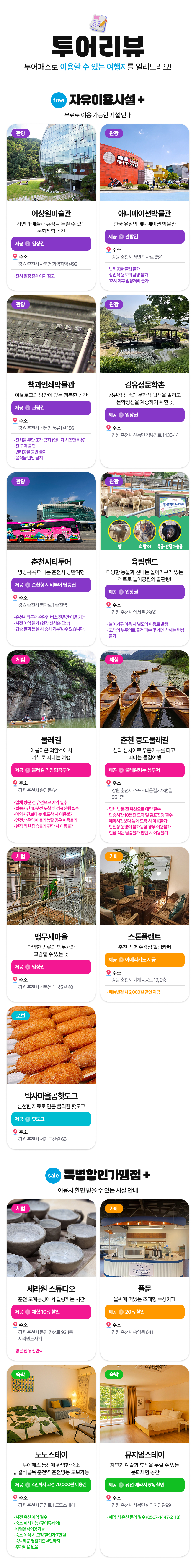 춘천 여행의 필수템! 춘천 투어패스와 함께 즐거운 시간을 보내보세요. 투어패스 하나면 유명 미술관, 박물관을 포함하여 레트로 테마파크까지 이용할 수 있어요. 춘천투어패스와 함께 합리적인 가격으로 24시간동안 알찬 여행을 즐겨 보세요!