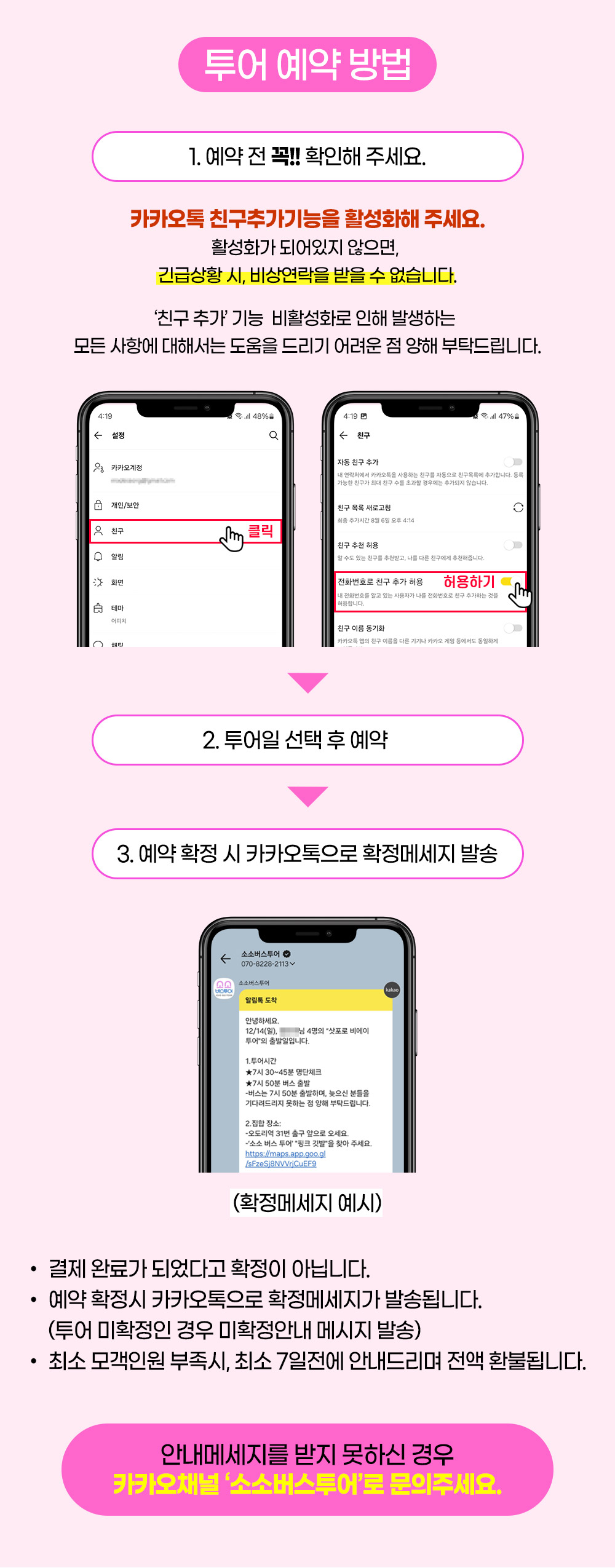 버스는 정각에 출발하니 늦지 않게 집합 장소로 모여 주시기 바랍니다.