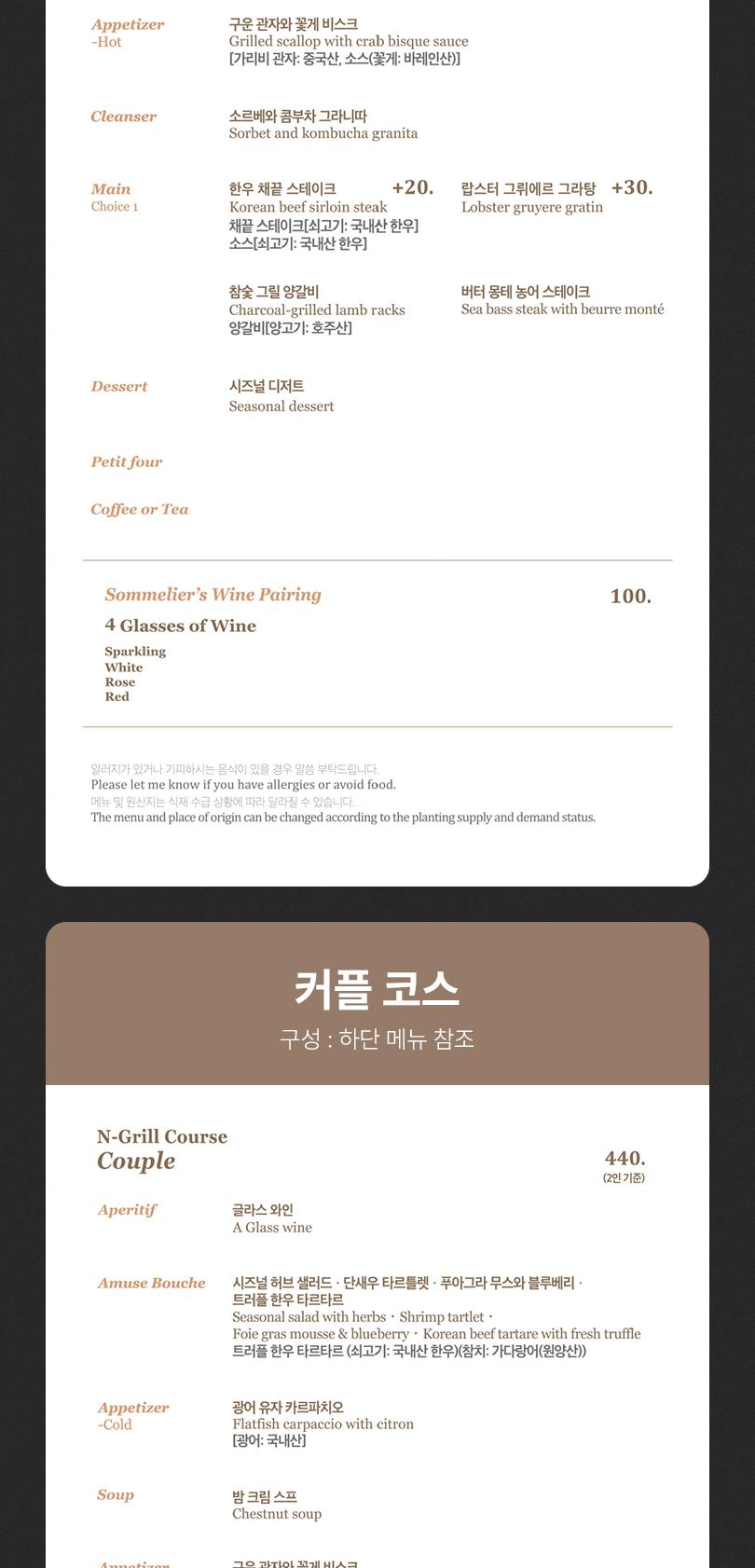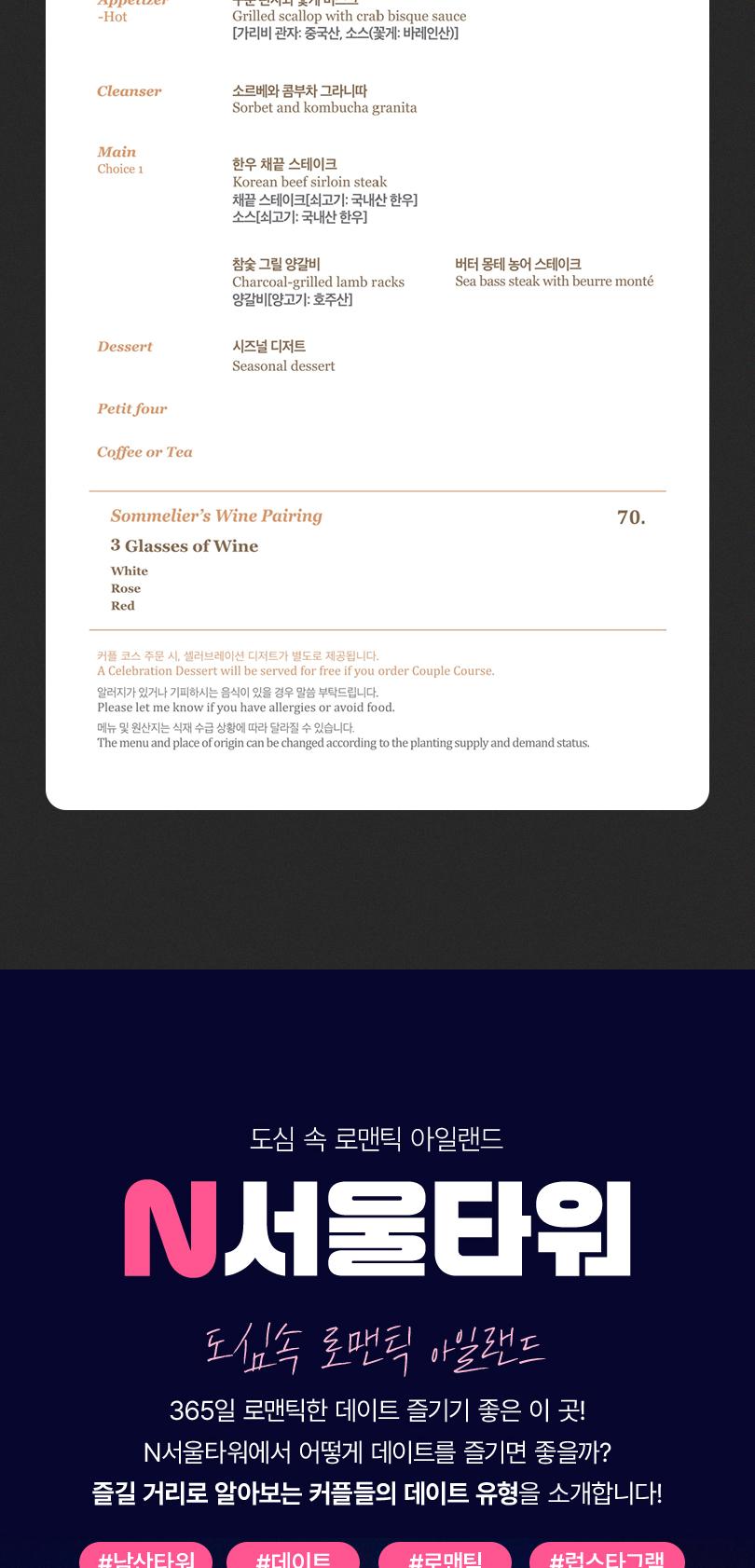특별한 날을 더욱 특별하게 만들어 줄 완벽한 식사와 N서울타워 전망대 데이트, 해당 패키지로 완벽한 하루를 만들어 보세요. 엔그릴은 N서울타워 가장 높은 곳에 위치한 최고의 뷰를 자랑하는 프렌치 레스토랑으로 한국의 재철 식재료와 프렌치코스가 만난 창의적인 메뉴와 함께 360도 돌며 파노라마로 펼쳐지는 서울의 아름다운 뷰를 감상할 수 있는 고품격 레스토랑이에요. 입맛을 돋우는 에피타이저부터 하이라이트인 메인메뉴와 마무리 디저트까지 환상적인 뷰가 곁들여진 다채로운 코스 요리를 즐기고 서울의 랜드마크인 N서울타워 전망대까지 즐기며 잊지 못할 하루를 만들어 보세요.