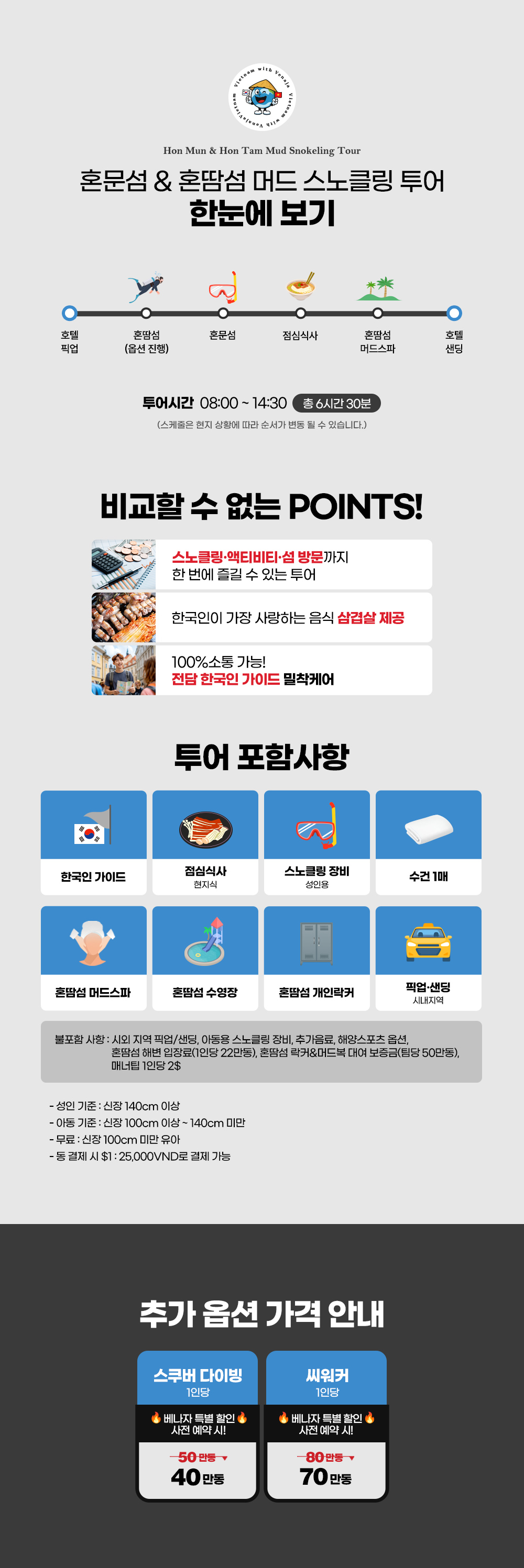 베스트혼땀머드스파와 스노쿨링을 한 번에 즐길 수 있어 만족했습니다. 나트랑은 즐길거리가 많아 이렇게 효율적인 상품 좋았어요~! 혼땀리조트는 숙박할까 고민했던 숙소였던만큼 머드투어하면서 살짝 분위기를 엿볼 수 있기에 아쉬움을 달랠 수 있었어요. 혼문섬에서는 물고기를 많이 봤어요. 아쉬웠던 점은 중간에 보트 바꿔타느라고 스킨스쿠버하는 곳에서 10분 정도 기다려야해서 불편하기도했고 시간도 아까웠어요. 점심식사는 일행끼리가 아닌 모르는 사람들과 쉐어해야하는 곳입니다. 저희는 백인가족과 함께했는데 현지식이 별로였는지 백인가족은 한 입 먹고 손도 안대는 분위기였는데 저희 아이가 맛있게 먹으니 신기한 듯 보는데 좀 민망했습니다. 사소한 부분 빼고 전체적인 진행은 만족합니다.