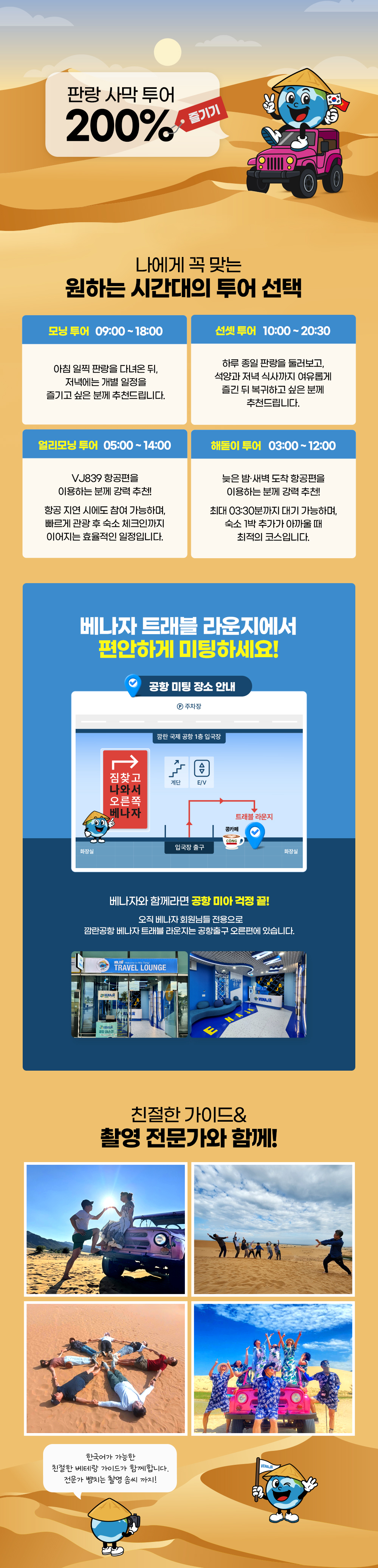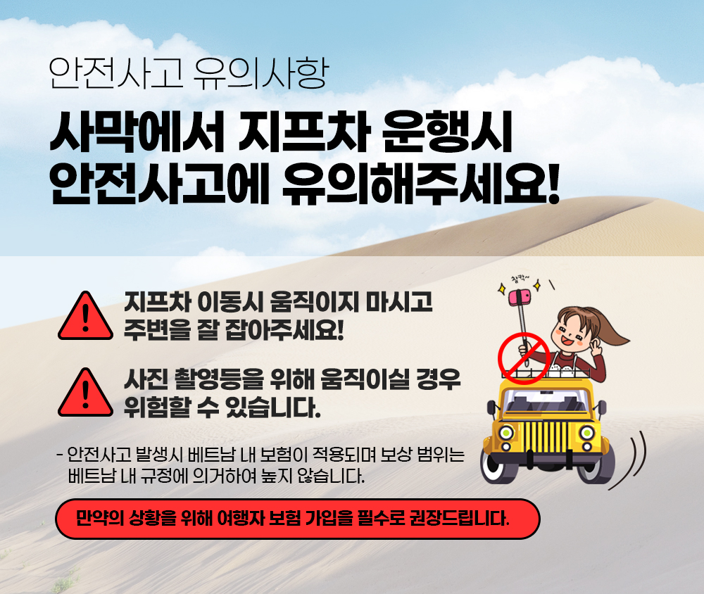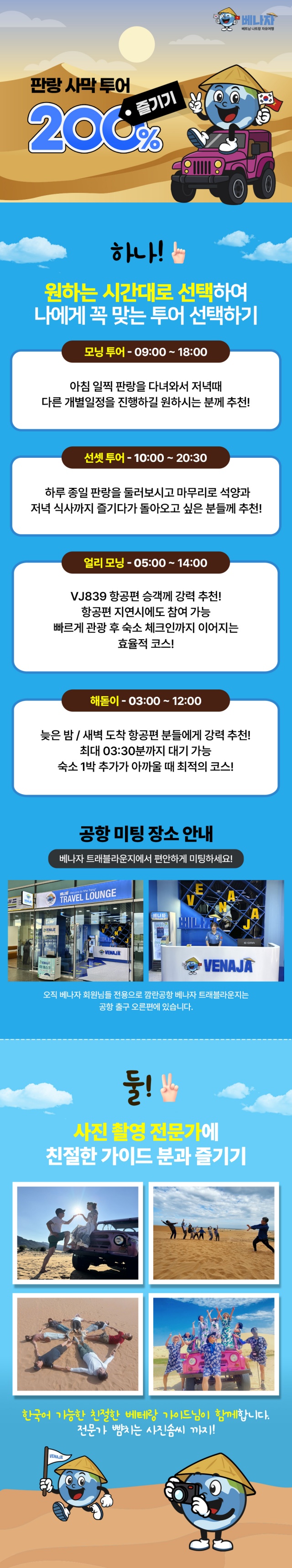 일정에 맞춰 모닝, 선셋, 얼리모닝, 해돋이 투어로 자유롭게 선택하여 판랑 사막의 매력을 경험해 보세요!