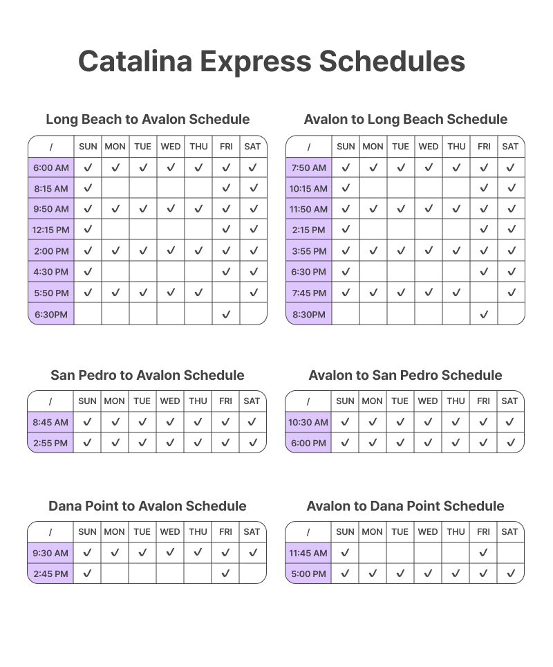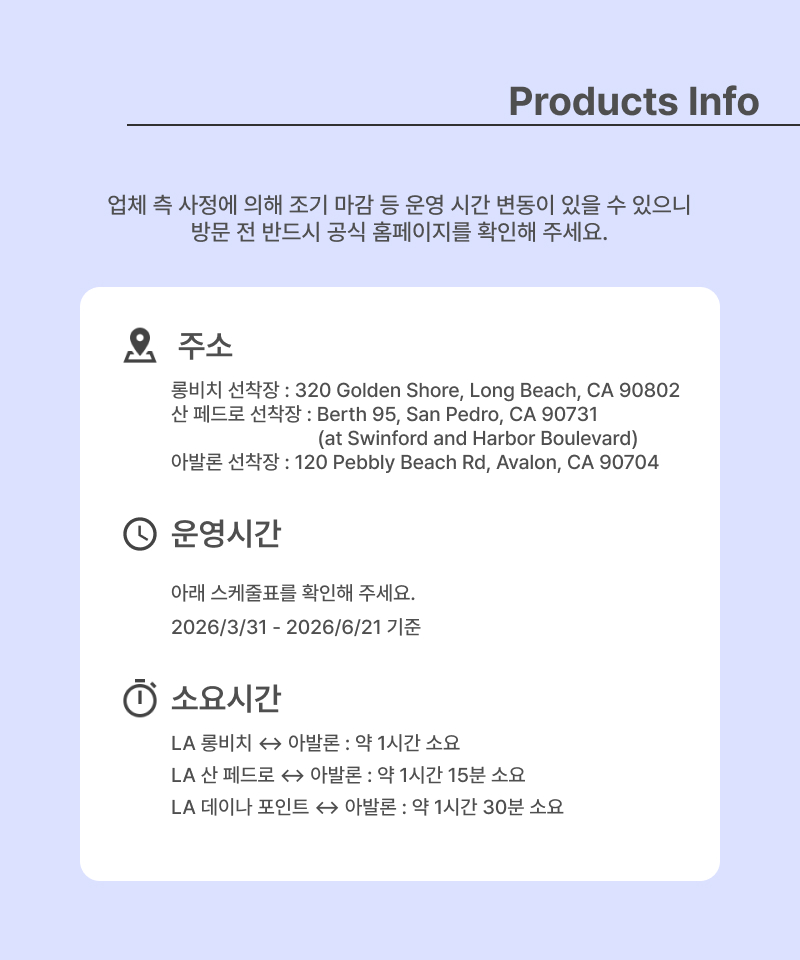 캘리포니아의 보석 같은 섬, 카탈리나섬으로의 완벽한 여행을 꿈꾸고 있다면 카탈리나 익스프레스 편도 페리를 이용해 보세요! 롱비치 또는 산 페드로에서 출발하는 페리는 파도 위에서 편안하고 안전한 여행을 즐기는 특별한 경험을 할 수 있어요. 롱비치에서 출발하면 약 1시간 15분, 산 페드로에서는 약 1시간 30분 만에 카탈리나섬의 아름다운 해안에 도착할 수 있어요. 페리를 타고 가는 동안, 편안한 좌석과 탁 트인 바다 전망을 즐기며 여유로운 시간을 보내보세요! 현대적인 시설을 갖춰 여행의 시작부터 끝까지 스트레스 없는 완벽한 경험을 할 수 있어요.