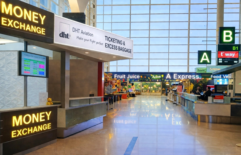 공항 내부 B 체크인 카운터 맞은편 TICKETING 부스 앞에서 직원 미팅
