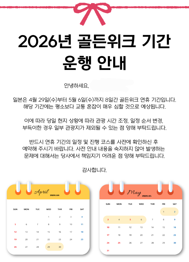 * 버스는 8시에 맞추어 출발하니 미팅 시간에 늦지 않도록 도착하여 주시기 바랍니다.