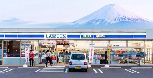 편의점 뒤로 보이는 후지산이 포인트인 곳이에요. 아름다운 풍경을 즐겨보세요!