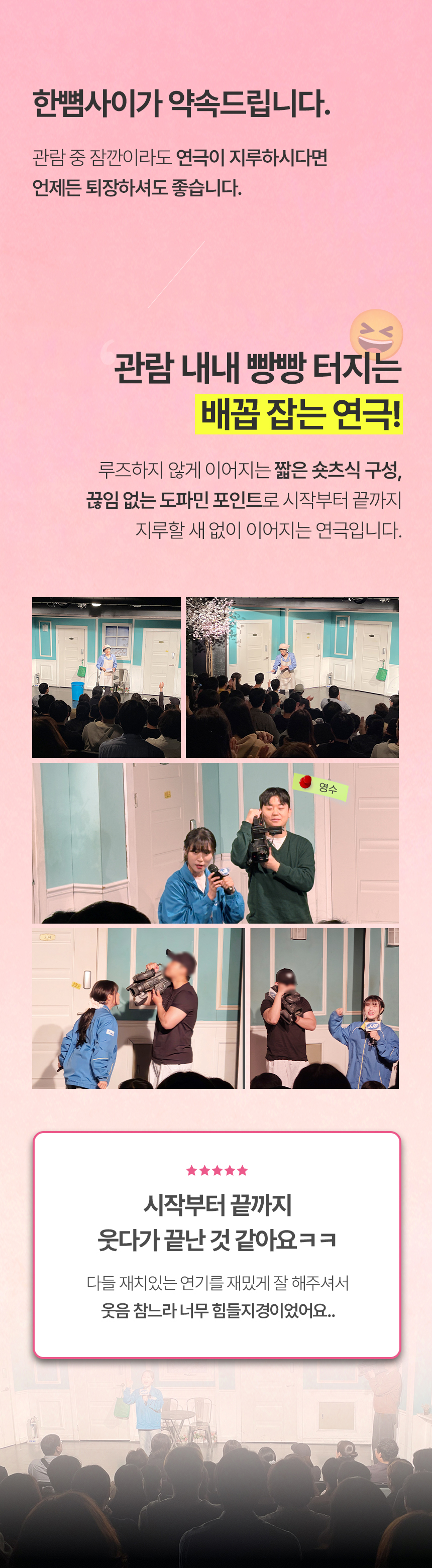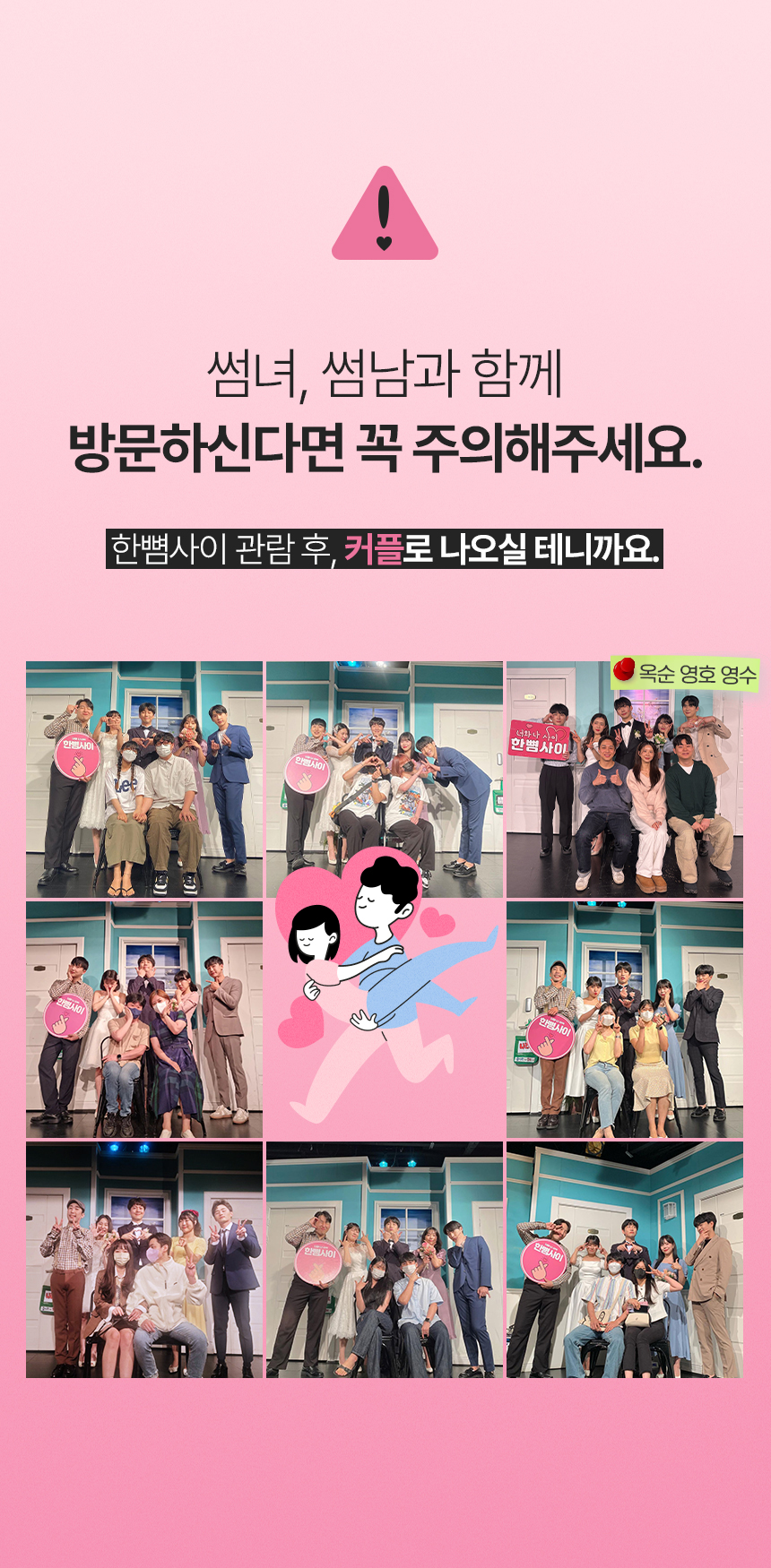 한뼘사이는 대학로 대표 커플메이킹 1위 연극이라는 별명을 가지고 있을 정도로 썸 타는 사이에도, 특별한 데이트를 원하는 연인에게도 추천하는 로맨틱 코미디 연극이에요. 연인인 듯, 친구인 듯, 한 뼘 사이를 두고 펼쳐지는 그들의 이야기를 감상하며 웃음 가득한 시간을 보내보세요.
