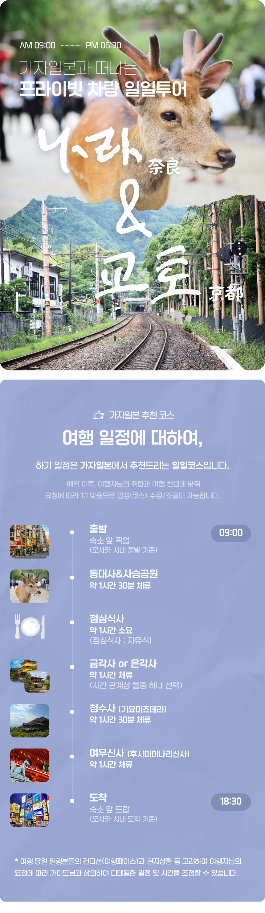 넓고 쾌적한 프라이빗 고급밴 차량을 타고 편안하게 이동하며 나라와 교토의 관광지를 구경해 보세요! 아이들, 부모님과 함께 여행을 계획하고 있지만 인원이 많아 이동이 고민이신 분들, 짐이 많아 여러 관광지를 돌아다니는 게 부담스러우신 분들에게 추천해 드리는 투어예요.