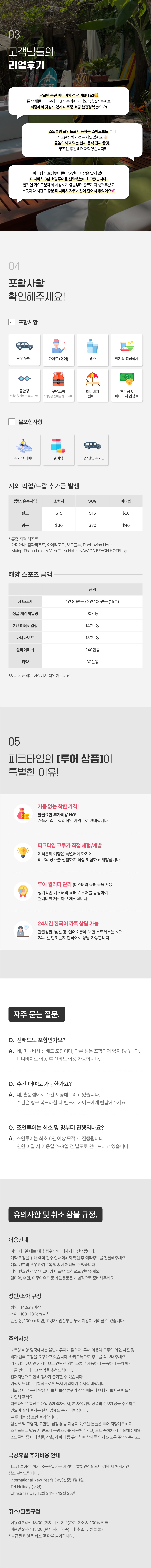 깨끗한 바다 속에서 귀여운 물고기를 보고 스노쿨링을 마음껏 하고 싶은 분들께는 이번 투어가 딱이에요. 혼문섬과 혼땀섬 모두에서 스노쿨링을 즐기실 수 있고, 더 짜릿한 액티비티를 원한다면 씨워킹이나 패러세일링 등 해양 스포츠를 추가하실 수 있어요. 프라이빗한 미니비치에서는 자유시간도 주어진답니다. 호텔 픽업 샌딩은 기본, 점심 식사까지 제공해드리는 이번 투어를 놓치지 마세요!