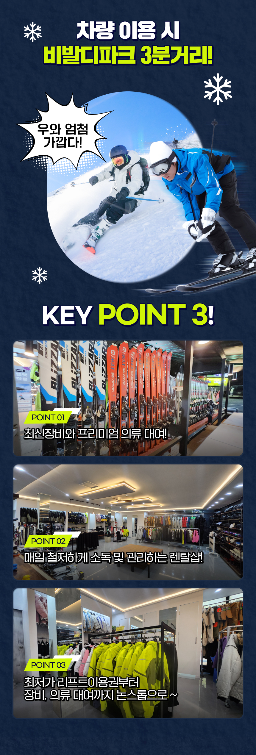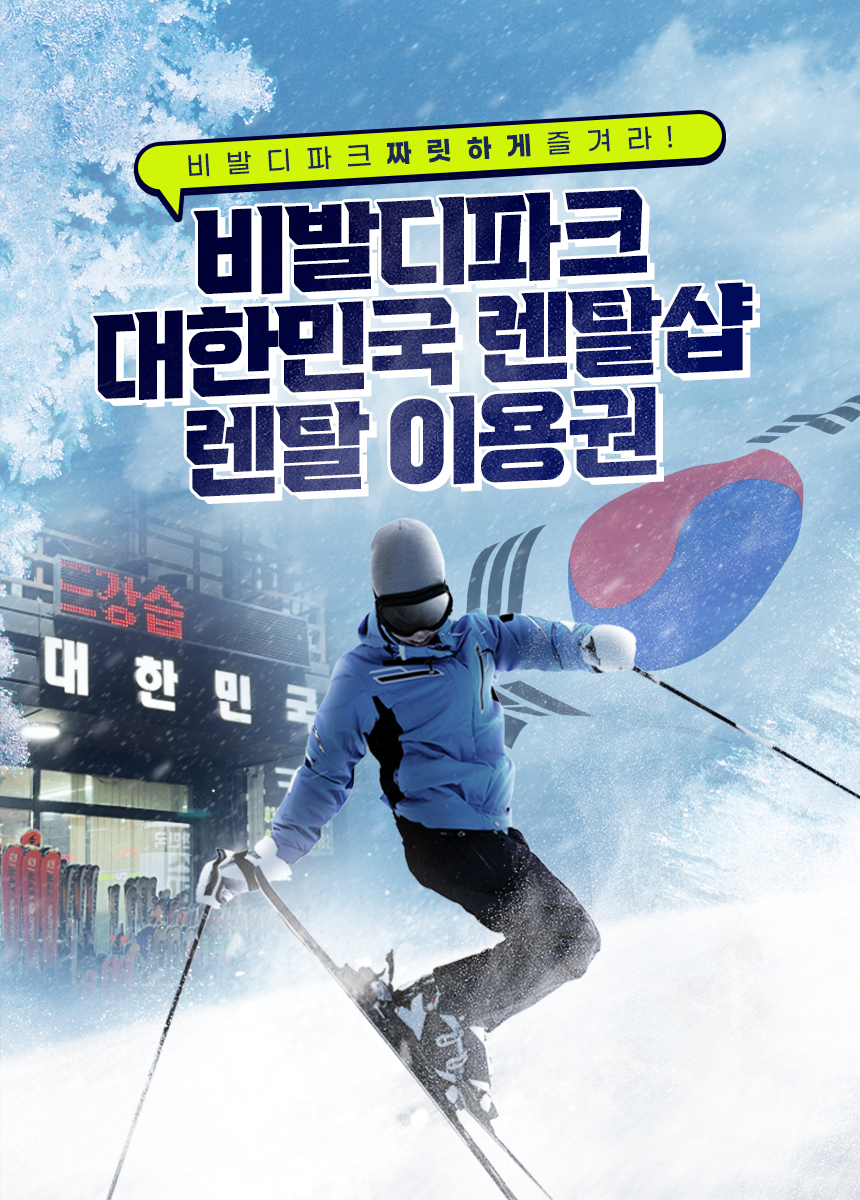 한국어 제공비발디파크에서 스키와 스노보드를 즐길 계획이신 분들은 모두 주목해 주세요! 비발디파크에서 차로 단 3분, 대한민국 렌탈샵을 추천드려요.