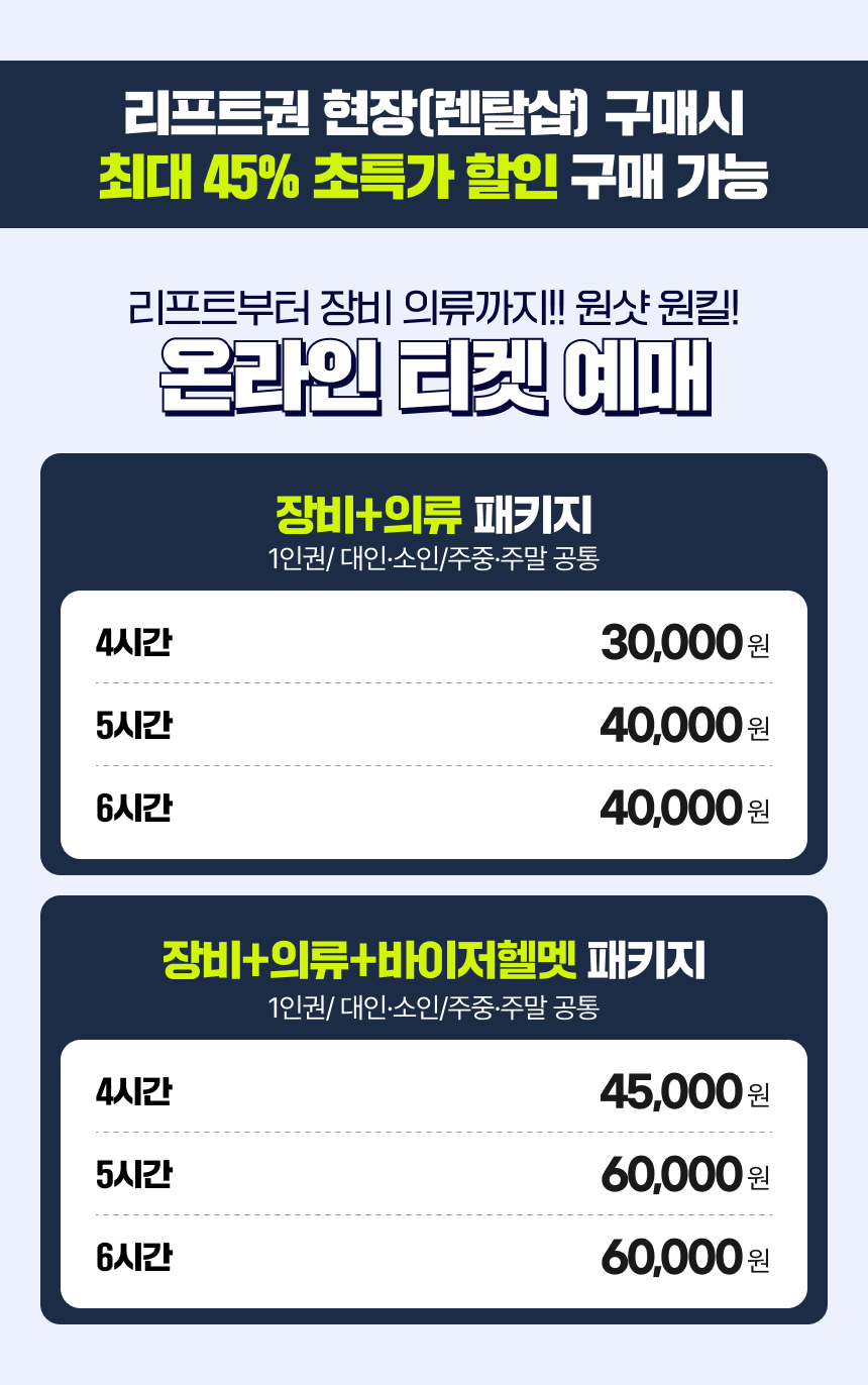 최신장비와 프리미엄 의류 대여는 물론 매일 철저하게 소독과 관리를 진행하여 믿고 렌탈할 수 있어요. 최저가 리프트 이용권부터 장비와 의류 대여까지 한 번에 해결할 수 있어 무척 편리하답니다. 넓고 쾌적한 대한민국 렌탈샵에서 올겨울 즐거운 시간을 보내보세요!
