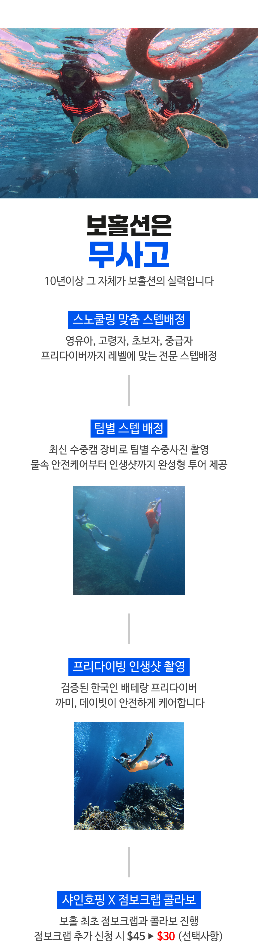 베스트와그에서 저렴하게 구매해서 호핑투어했어요❤️👍 완전~대 만족! 한국인 가이드 까미님이 투어하시는분들 한분 한분 다 케어해주셨구요👍 저희 담당 가이드 캐빈🥰 정말 수영도 못하는 저를 잘 이끌어주셔서 아름다운 보홀 바닷가를 볼 수 있었어요! 선상 라면은 말못!!!! 정말 맛났고 세심히 아이들을 위한 도시락도 챙겨주셨습니다!🥹🥹 그리고, 지루하지않게 선상 퀴즈, 멋진 댄스 등! 지루할틈이 1도없는 호핑투어였습니다🥹🥹👍👍 더더 번창하셔서 호핑투어 스탭분들 더욱더 바빠지시길 바랄게요👊 행복한 보홀 투어 만들어주셔서 감사합니다 ❤️📷 아이가 이번 보홀 여행에서 호핑투어 제일 최고였다고 엄지척척👍👍👍 해주어서 정말 뿌-듯하였답니다!