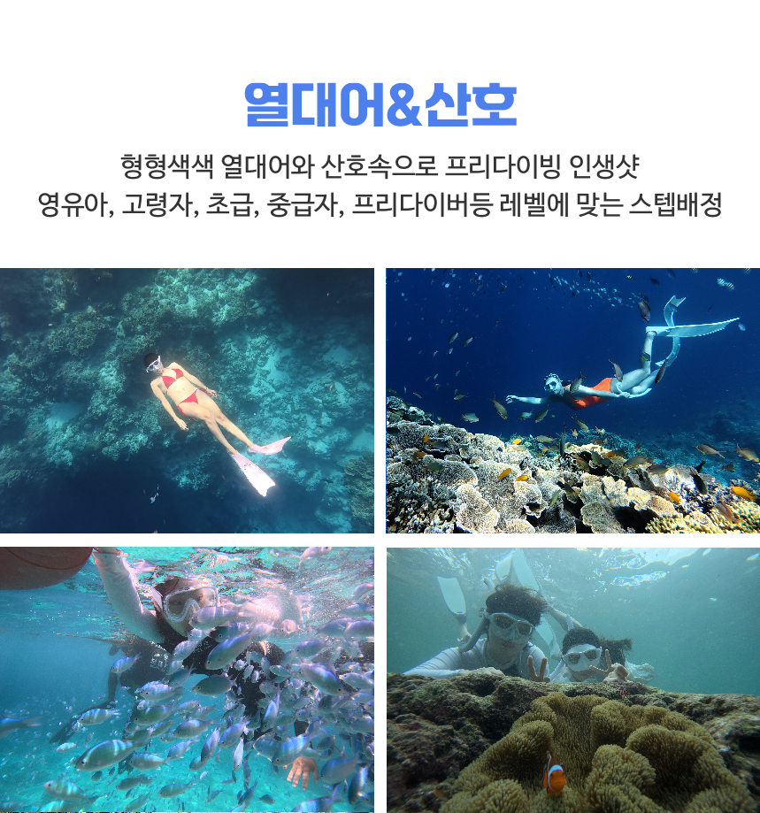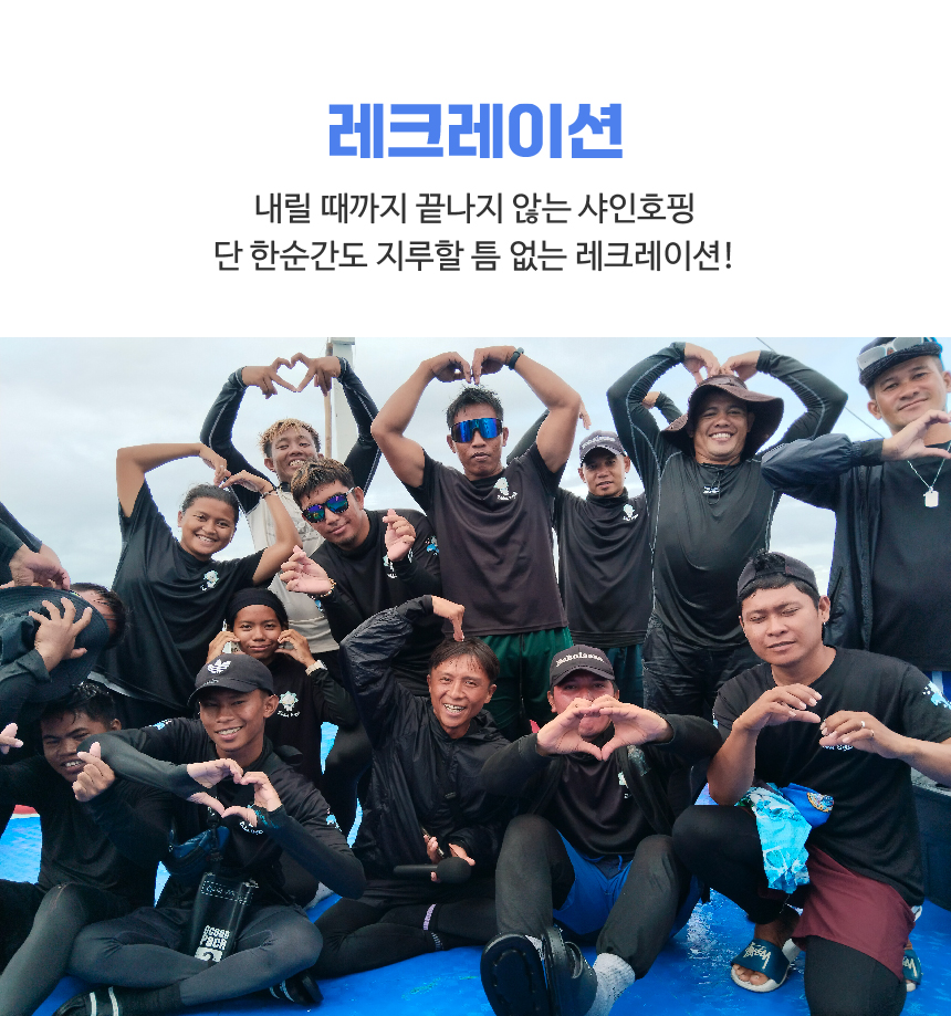 보홀에서 짜릿한 해양 액티비티를 즐겨보세요! 미친 텐션의 선상 레크리에이션, 팀별 전담 가이드의 인생샷 촬영 & 맞춤 케어, 최소 2회 이상 보장되는 스노클링까지! 팡라오 지역 무료 픽업 & 드랍 서비스로 시작부터 끝까지 편안하고 세심한 가이드를 제공해드려요.