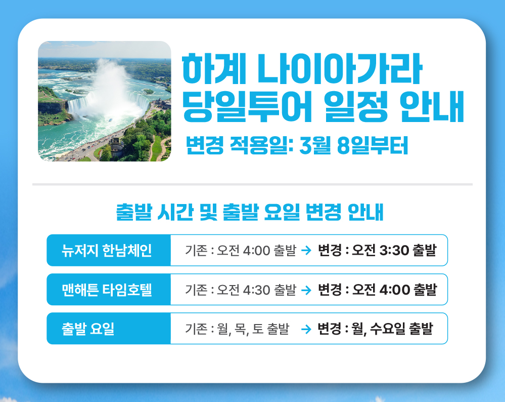 베스트나이아가라 폭포 당일 투어 후기 🌊🚌 최근 뉴욕 여행 중 하루 시간을 내어 나이아가라 폭포 당일 투어를 다녀왔습니다. 결론부터 말하자면, 정말 강력 추천드리고 싶을 만큼 만족도가 높았던 투어였어요! 🧭 조탁 가이드님 덕분에 더욱 완벽했던 하루 무엇보다 이번 투어가 즐거웠던 건 조탁 가이드님 덕분이었습니다. 미국 생활 경력도 길고 지식도 풍부하셔서, 단순히 관광지를 소개하는 걸 넘어서 폭넓고 흥미로운 배경 설명까지 곁들여주셔서 정말 유익했어요. 말씀도 정말 재밌게 잘하시고, 투어 내내 참가자들을 세심하게 배려해주셔서 감동받았습니다. 🚌 리무진급 버스, 안심되는 기사님 운전 교대 이동은 넓고 쾌적한 리무진급 버스로 진행되어 장거리 이동도 전혀 힘들지 않았습니다. 특히 두 분의 기사님이 번갈아 운전하셔서 더욱 안심이 되었고, 편안하게 휴식하며 이동할 수 있었어요. 🌊 유람선/캐나다 입국 설명까지 완벽 현장에서 유람선(안개 숙녀호), 바람의 동굴, 캐나다 입국 관련해서도 사전 설명이 꼼꼼하게 이뤄졌고 선택 여부도 자유롭게 할 수 있어서 부담이 전혀 없었어요. 추가 팁 요청도 따로 없어서 오히려 신뢰가 갔고, 순수하게 여행 자체에만 집중할 수 있었답니다. 🍴 식사 & 기념품 정보도 쏙쏙 중간에 어디서 식사하면 좋은지, 어떤 기념품이 괜찮은지까지 가이드님이 직접 추천해주셔서 선택에 고민이 줄었어요. 투어 자체가 알차고, 동선도 잘 짜여 있어서 짧은 하루지만 매우 효율적으로 다녀올 수 있었습니다. 🙌 다음엔 퀘백으로! 가이드님께서 말씀해주신 대로, 다음 뉴욕 방문 시엔 꼭 퀘백 투어도 한번 가보고 싶다는 생각이 들 정도로 좋은 인상을 받았습니다. --- 💬 마무리 한 마디 뉴욕 여행 중 하루쯤은 나이아가라로 떠나보세요! 좋은 날씨, 멋진 폭포, 그리고 따뜻한 가이드님의 배려까지 더해진 이번 투어는 오랫동안 기억에 남을 것 같습니다. 다음에도 꼭 같은 투어 다시 이용하고 싶어요 :)