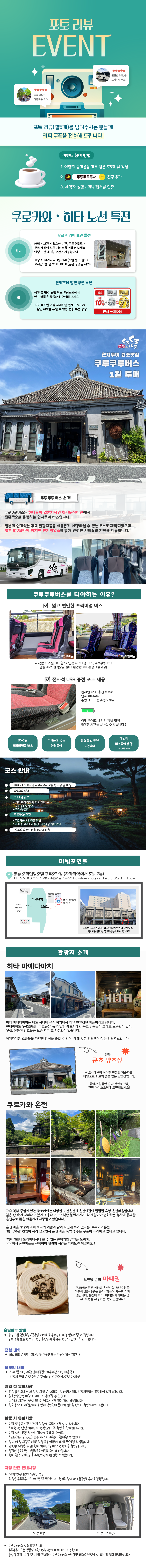 후쿠오카에서 출발하는 하루 동안의 완벽한 여행 쿠루쿠루버스와 함께라면 더욱 특별해져요. 일본 여행 전문 기업 하나투어재팬이 운영하는 이 투어 버스는 넓고 편안한 좌석과 전 좌석 USB 충전 포트를 갖춘 프리미엄급 서비스로 이동하는 동안에도 쾌적하게 여행할 수 있어요.