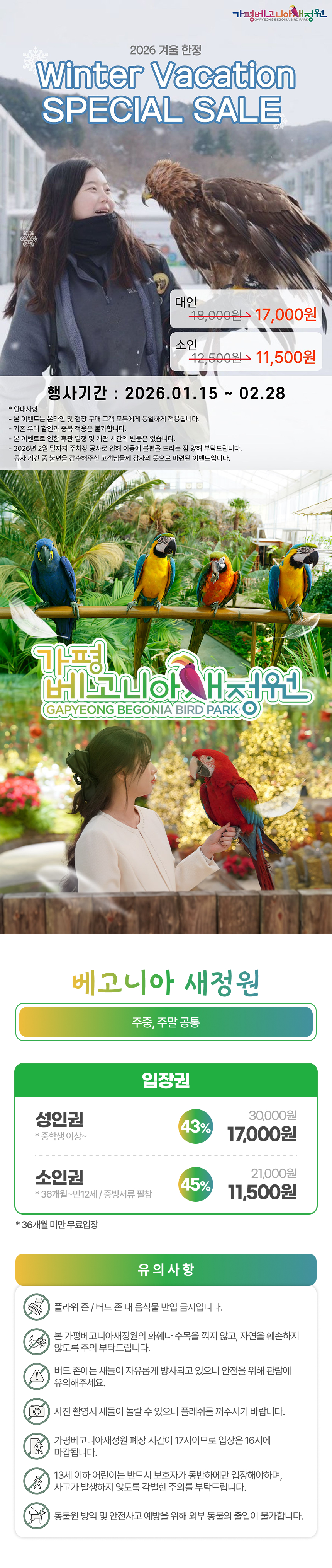 한국어 제공아이도 어른도 웃게 되는 겨울 힐링 여행 🌿 꽃과 새 그리고 정원이 함께하는 베고니아새정원, 지금 특가로 만나보세요! 🌸🐦 판매기간 : 2026.01.15 ~ 2026.02.28 유효기간 : 구매일 ~ 2026.02.28