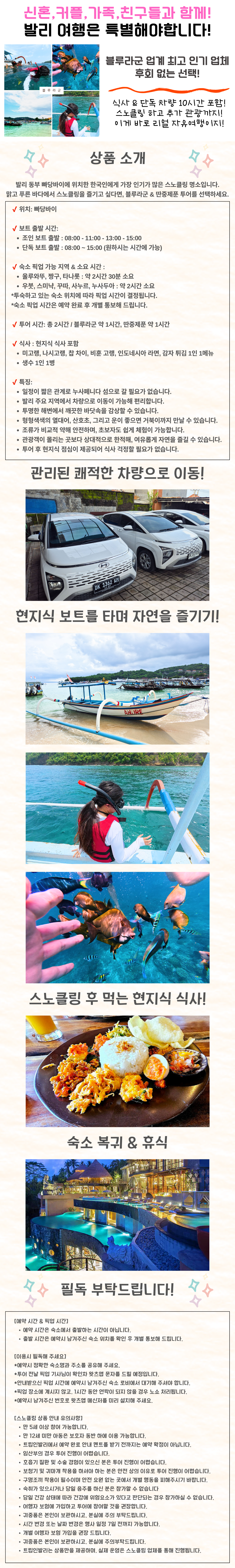베스트뉴사페니다 섬에 이동하기 어려우신 분에게 적극 추천해요~~~ 숙소에서 1시간30분? 생각보다 장거리였어요 암튼.... 일단 생각했던 것 보단 바닷물이 정말 생각보다 맑았어요! 장비는 여럿이 사용하는 게 싫어 개인장비를 챙겨왔고, 사진은 찍어달라고 하면 잠수복 입은 직원분이 열심히 찍어줘서 좋았어요^^