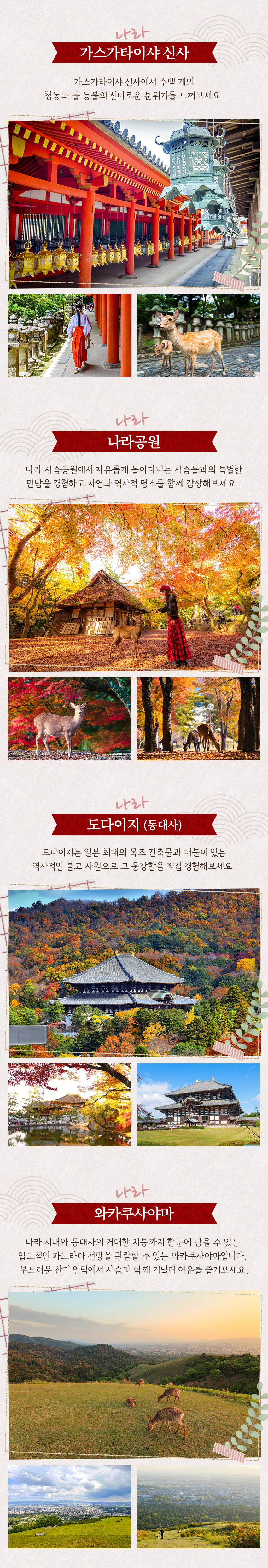 나라공원에서는 귀여운 사슴들과 교감하고, 동대사에서는 웅장한 대불상을 만나고, 고즈넉한 분위기의 가스가타이샤 신사까지 방문하는 완성도 높은 일일 투어로 떠나보세요!