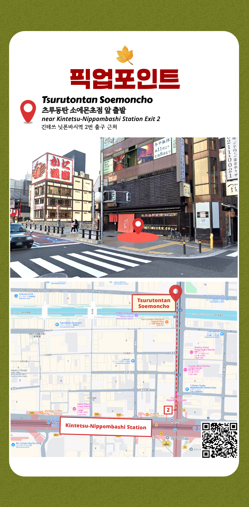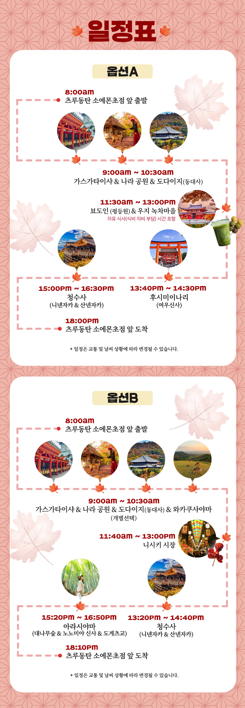 한국어 제공,영어 제공25년 11월 4일부터 신규 B코스의 운영이 시작됩니다. B 코스의 일정은 아래와 같습니다. 08:00 am 츠루동탄 소에몬초 점 앞 출발 (출발 10분 전까지 도착 부탁드립니다.) 09:00 ~ 10:30 am 가스가타이샤 & 나라공원 & 동대사 & 와카쿠사 산 (자유롭게 시간을 분배하여 이용해주세요.) 11:40 am ~ 1:00 pm 니시키 시장 1:20 ~ 2:40 pm 기요미즈데라(청수사) / 산넨자카 & 니넨자카 3:20 ~ 4:50 pm 아라시야마 (대나무숲, 노노미야신사, 도게츠교) 6:10 pm 츠루동탄 소에몬초 점 앞 하차
