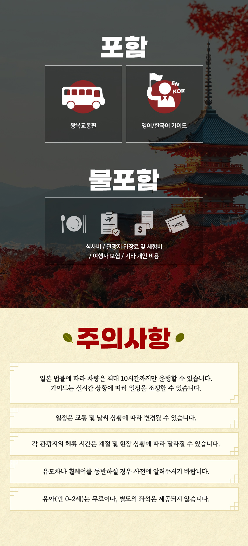 베스트11개월 아기랑 부모님과 함께하는 여행이라 버스투어를 알아보고 있었는데 마침 여기가 아기랑 여행이 가능해서 예약하게 되었습니다! 우선 가이드분이 매우매우 친절하시고 소통이 가능해서 너무너무 좋았습니다!! 불필요한 설명해서 버스에서도 피곤한 그런 투어와는 다르게 딱딱 필요한 내용만 설명해주시고 나머지 시간은 쉬게 해주셔서 너무 좋앗슴니다! 그리고 유모차가 있었는데 내릴때마다 기사님이 미리 펴주셔서 너무너무 감동이였어요 ㅠㅠ 나라공원에서 사슴도 보고 신사도 가고 청수사도 가고 8시부터 6시까지 아주 알차고 좋은 여행이였습니다! 중간중간 가이드님이 따로 관광지에 대해 설명도 해주시는게 정말 좋앗어요!! 어린 아기와 같이 여행을 하거나 부모님과 교토 관광을 하고 싶다!! 하시는 분들 이 버스투어 꼭 추천드릴게용~ 전혀 돈이 아깝지 않은 그럼 시간이였습니다! 즐거운 추억 만들어주셔서 너무 감사드랴용🙇♀️🩷