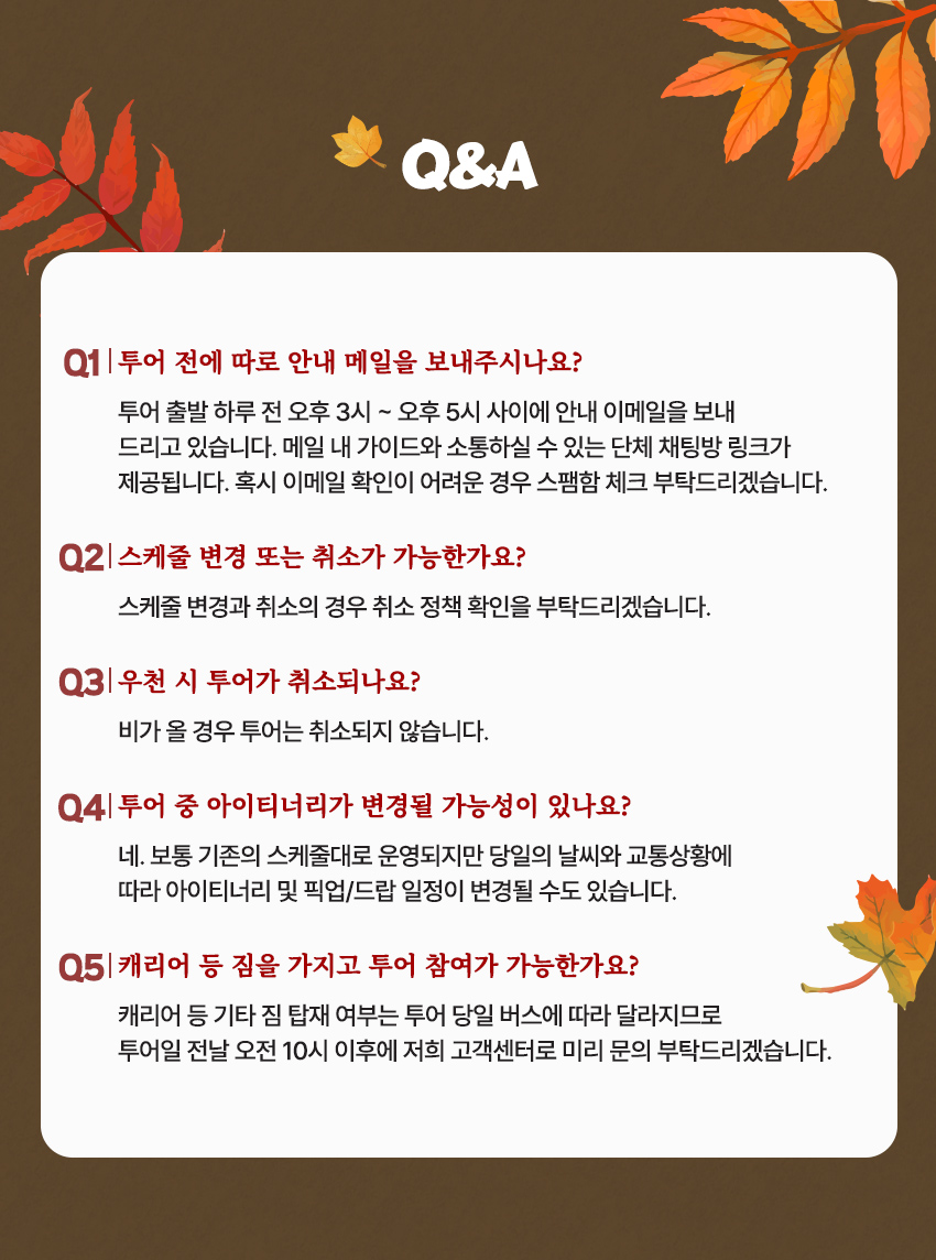출발 시간 10분 전까지 미팅 포인트로 집합해 주세요.