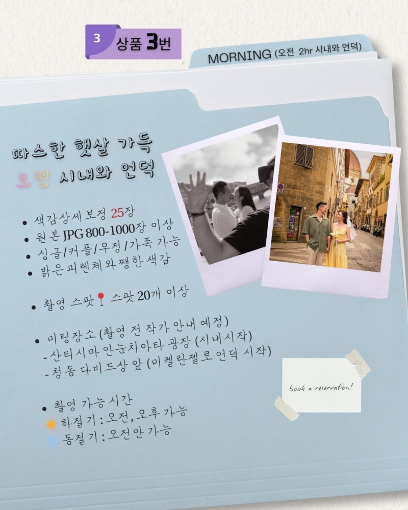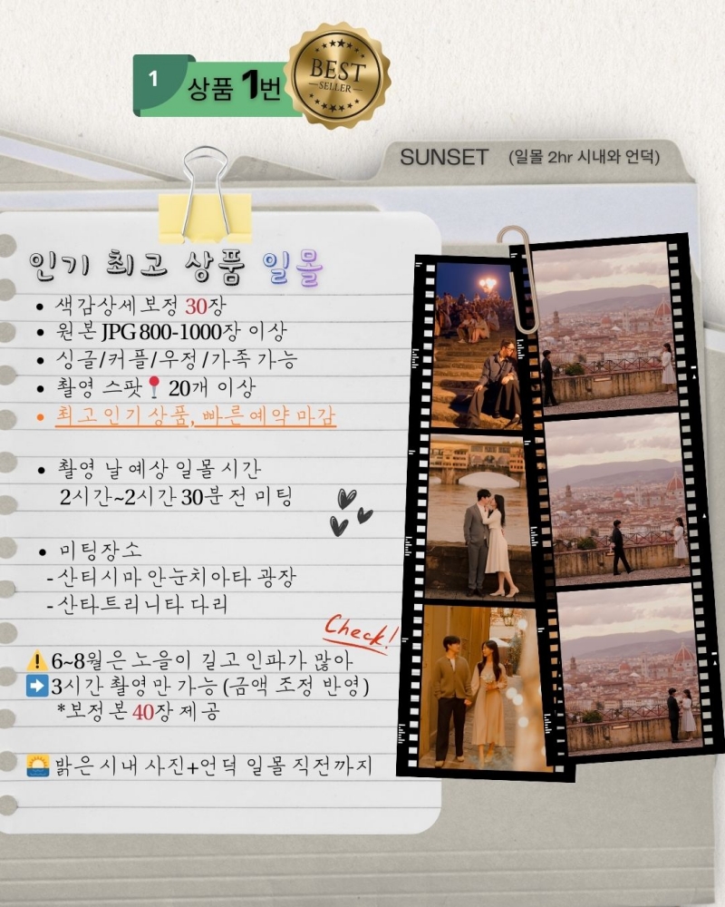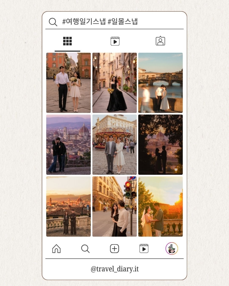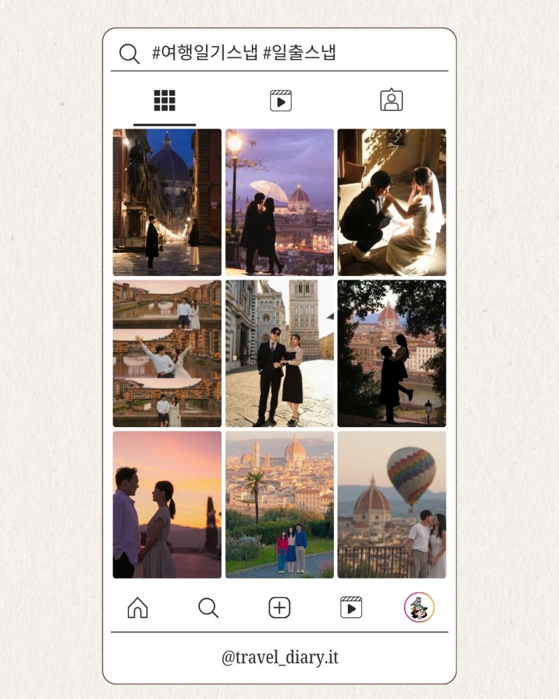 피렌체 스냅 촬영 전문 '여행일기'가 부담 없는 가격으로 여러분의 소중한 순간들을 아름답게 담아드릴게요! 웨딩 촬영처럼 딱딱한 분위기가 아닌, 여행하는 기분으로 자연스러운 인생샷을 남겨보세요. 골목골목 빛나는 조명과 어우러진 피렌체의 낭만적인 풍경 속에서, 전문 작가님이 편안하고 섬세하게 최고의 순간을 포착해 드릴 거예요. 곳곳에 예쁜 곳이 넘쳐나는 이 곳에서 제대로 된 사진 촬영에 도전해 보세요. 뚝딱이여도 괜찮아요! 우리에게는 전문 작가님이 계시니까요. 여러군데를 옮겨 다니시지 않고 피렌체에만 거주하며 피렌체의 감성을 누구보다 잘 아는 작가님께 믿고 맡겨보세요!