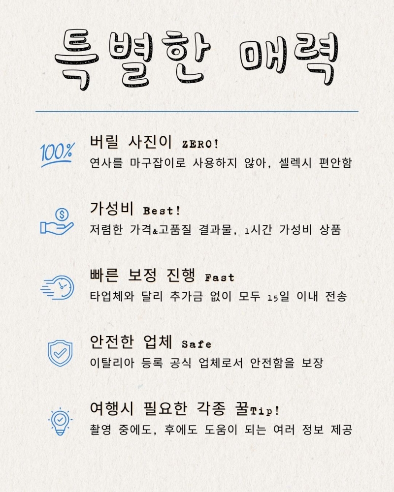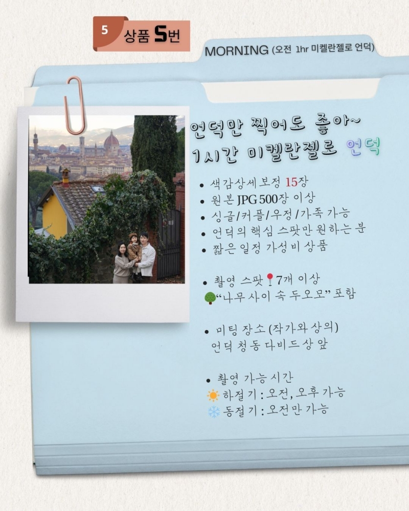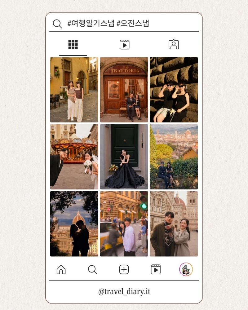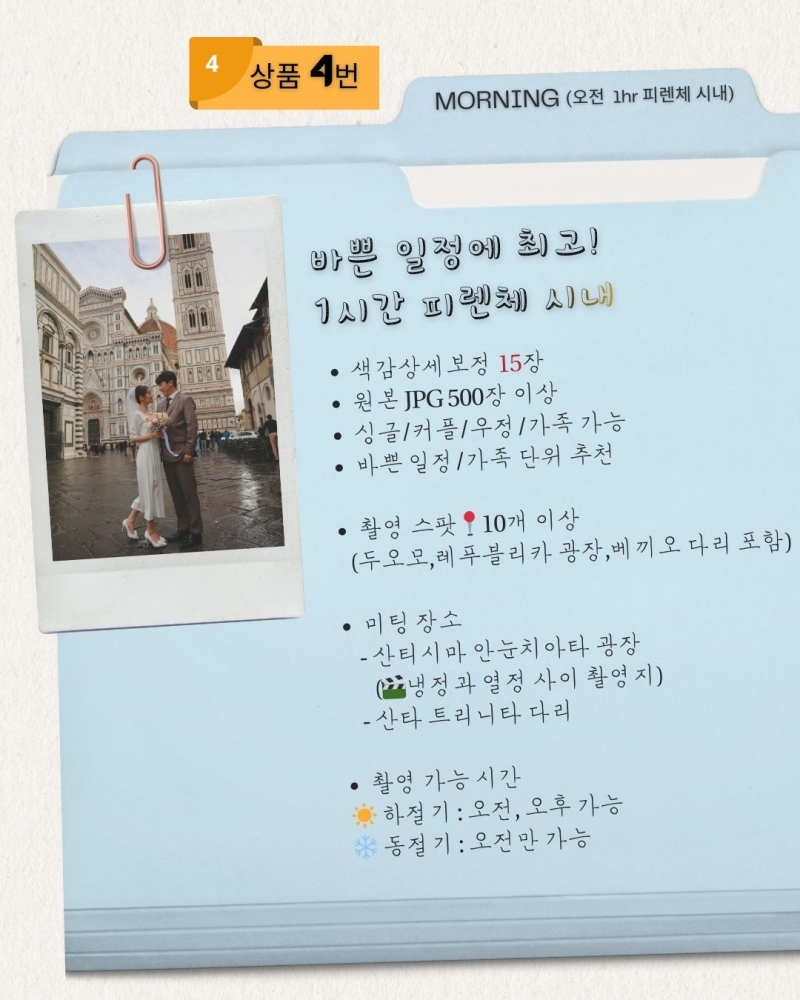 피렌체 스냅 촬영 전문 '여행일기'가 부담 없는 가격으로 여러분의 소중한 순간들을 아름답게 담아드릴게요! 웨딩 촬영처럼 딱딱한 분위기가 아닌, 여행하는 기분으로 자연스러운 인생샷을 남겨보세요. 골목골목 빛나는 조명과 어우러진 피렌체의 낭만적인 풍경 속에서, 전문 작가님이 편안하고 섬세하게 최고의 순간을 포착해 드릴 거예요. 곳곳에 예쁜 곳이 넘쳐나는 이 곳에서 제대로 된 사진 촬영에 도전해 보세요. 뚝딱이여도 괜찮아요! 우리에게는 전문 작가님이 계시니까요. 여러군데를 옮겨 다니시지 않고 피렌체에만 거주하며 피렌체의 감성을 누구보다 잘 아는 작가님께 믿고 맡겨보세요!